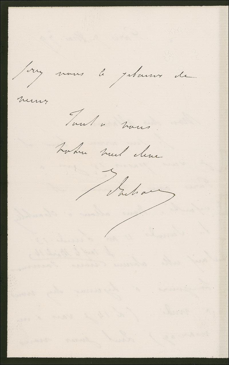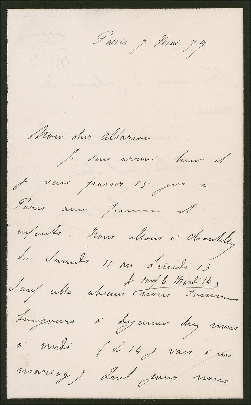 Grandson of King Louis-Philippe of France. He fought for the Union in the American Civil War, and then for France in the 1870 Franco-Prussian War. ALS in French, signed “R. of Orleans,” one page both sides, 4.5 x 7, black-bordered personal letterhead, May 7, 1879. In part: “I just arrived yesterday. I’ll be in Paris with my daughter and children. We’ll go to Chantilly…What day will you come and see us?” In fine condition. RRAuction COA.