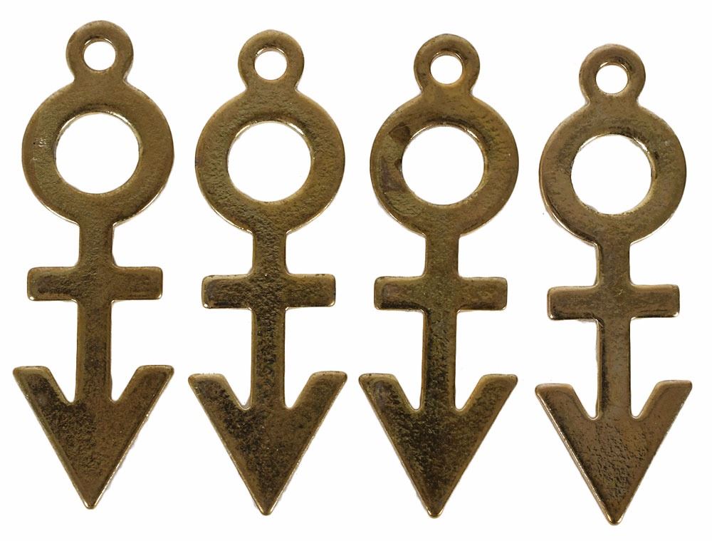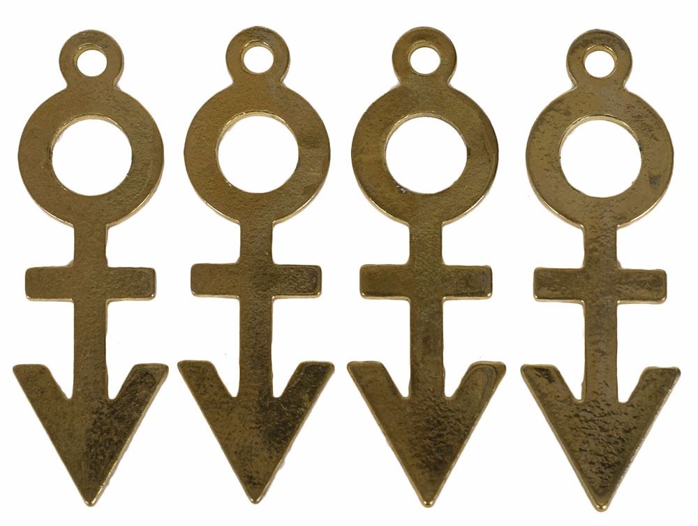 Four small golden metal Prince symbol charms custom-made for him and used in the on-set wardrobe supply during Graffiti Bridge movie and Nude Tour, each measuring approximately 1.5 x .5. Prince is seen wearing this type of charm on the zipper pulls of his leather jacket in promo materials; whether or not he wore any of these particular examples is uncertain. In overall fine condition. From the collection of costume designer Helen Hiatt and accompanied by a letter of provenance.