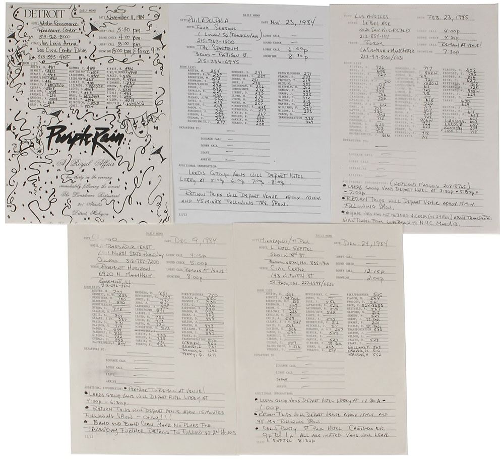 Five photocopied daily memos from the Purple Rain Tour, dated from November 11, 1984, to February 23, 1985, listing hotels, venues, schedules, and room lists for the crew and musicians. All measure 8.5 x 11 except for the first, which measures 8.5 x 14 and includes an invitation for a private after party during the tour's opening series of shows in Detroit. The others include: November 23, 1984, in Philadelphia; December 9, 1984, in Chicago; December 24, 1984, in Minneapolis, which refers to his hometown Christmas shows; and February 23, 1985, in Los Angeles. In overall fine condition. From the collection of Prince's assistant tour manager Gwen Leeds, who notes that Prince, Sheila E., and the members of The Revolution are listed under pseudonyms in the room lists. These daily memos were prepared by the tour managers and distributed nightly under each member of the entourage's hotel room door.