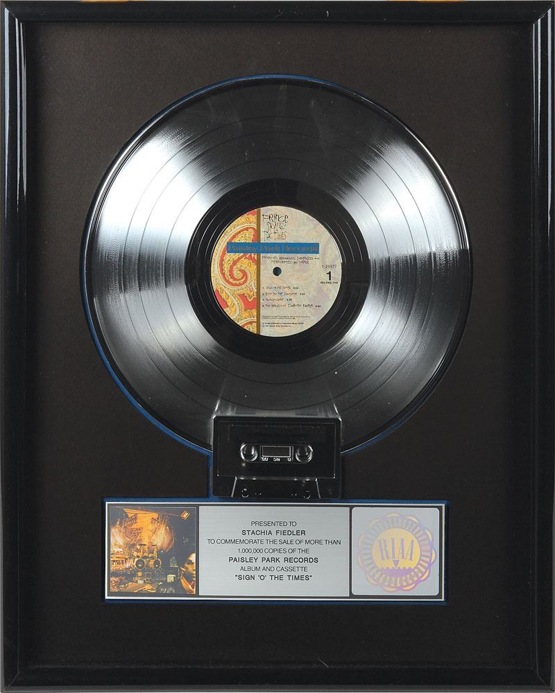 Official RIAA flower hologram-style platinum sales award presented "to Stachia Fiedler to commemorate the sale of more than 1,000,000 copies of the Paisley Park Records album and cassette 'Sign 'o' the Times.'" Framed with its disc, cassette, and plate bearing a small image of the album cover to an overall size of 17 x 21. Award retains its original backing with a Fitzgerald Hartley Marketing label. In fine condition. From the collection of Prince's assistant Stachia Fiedler.