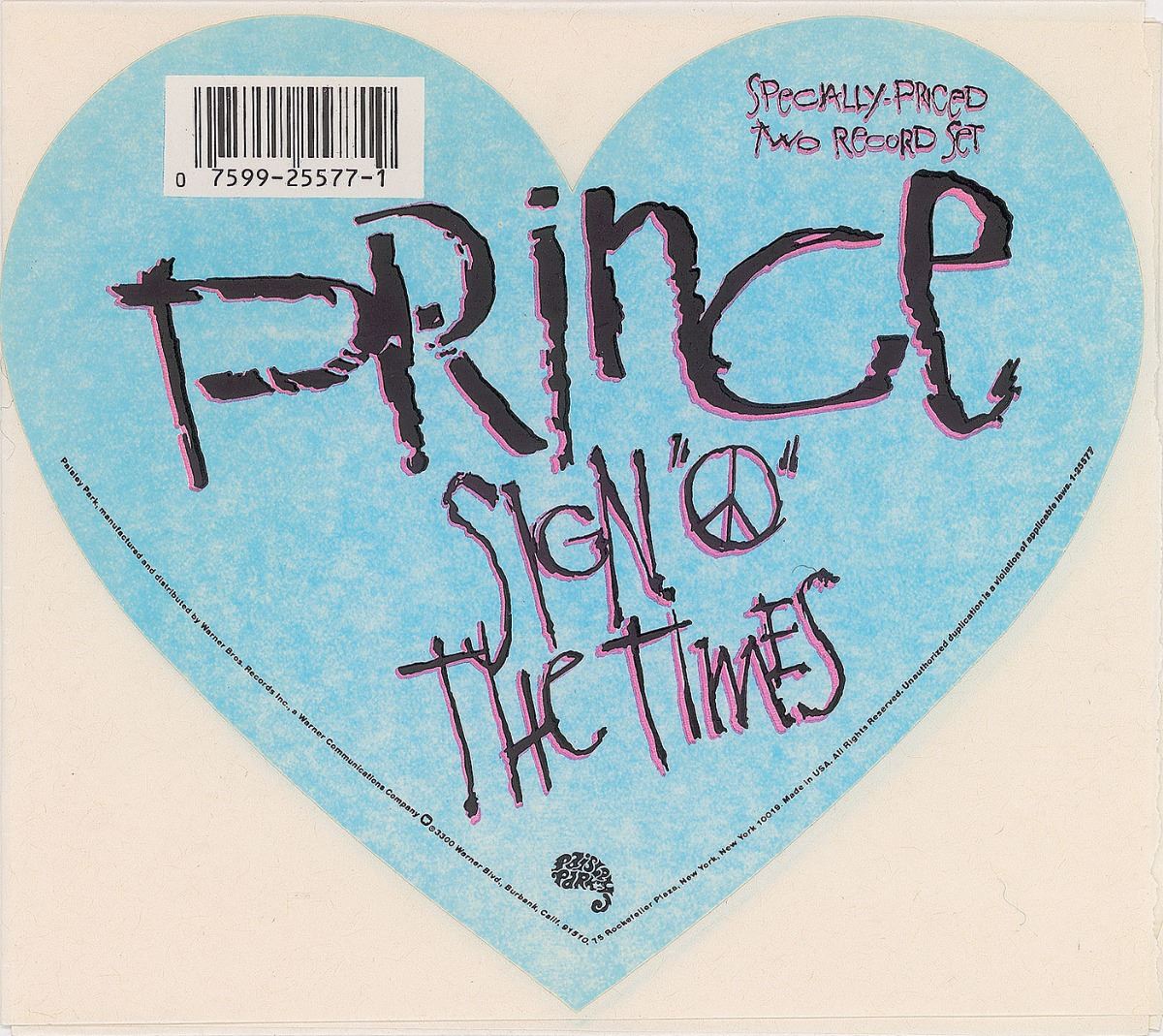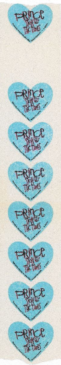 Two sheets of heart-shaped stickers sent as proofs for the Paisley Park Records release of Sign o’ the Times, the ninth studio album from Prince. The first sheet features four 7 x 6 stickers designed for the “Specially-Priced Two Record Set”; and the second sheet consists of eight 1.75 x 1.75 stickers intended for the “Specially-Priced Double-Play Single Cassette.” In overall fine condition.