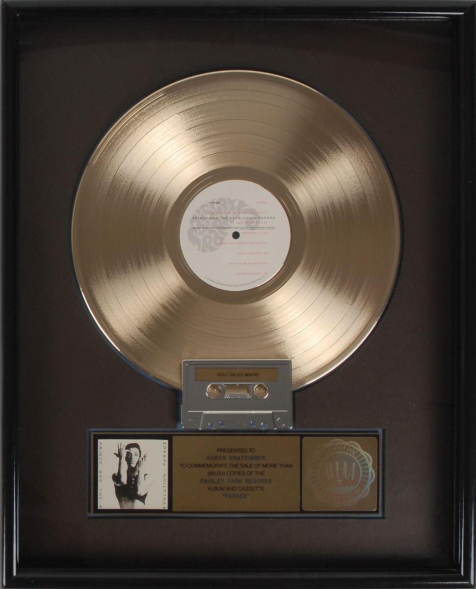 Official flower hologram-style RIAA gold sales award presented “to commemorate the sale of more than 500,000 copies of the Paisley Park Records album and cassette ‘Parade.’” Framed with its disc, cassette, plate, and a small image of the album cover to an overall size of 17 x 21. Award retains its original backing with a Fitzgerald Hartley label. In fine condition.