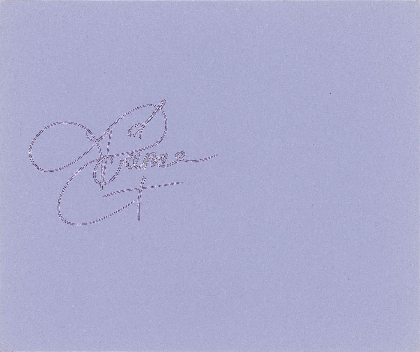 Large metallic purple ink signature, "Prince,” on a light purple 7.75 x 6.5 sheet. In very fine condition. From the collection of Prince's assistant Stachia Fiedler, who notes that this was signed on Prince's 27th birthday, June 7, 1985, at his 'Masquerade Ball' party at the Prom Center in St. Paul. Accompanied by a full letter of authenticity from REAL. An ideal example of the 'Purple Rain' creator's autograph.