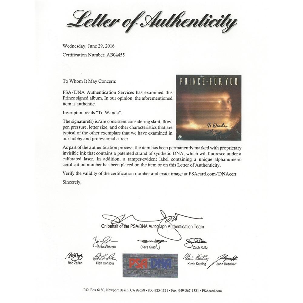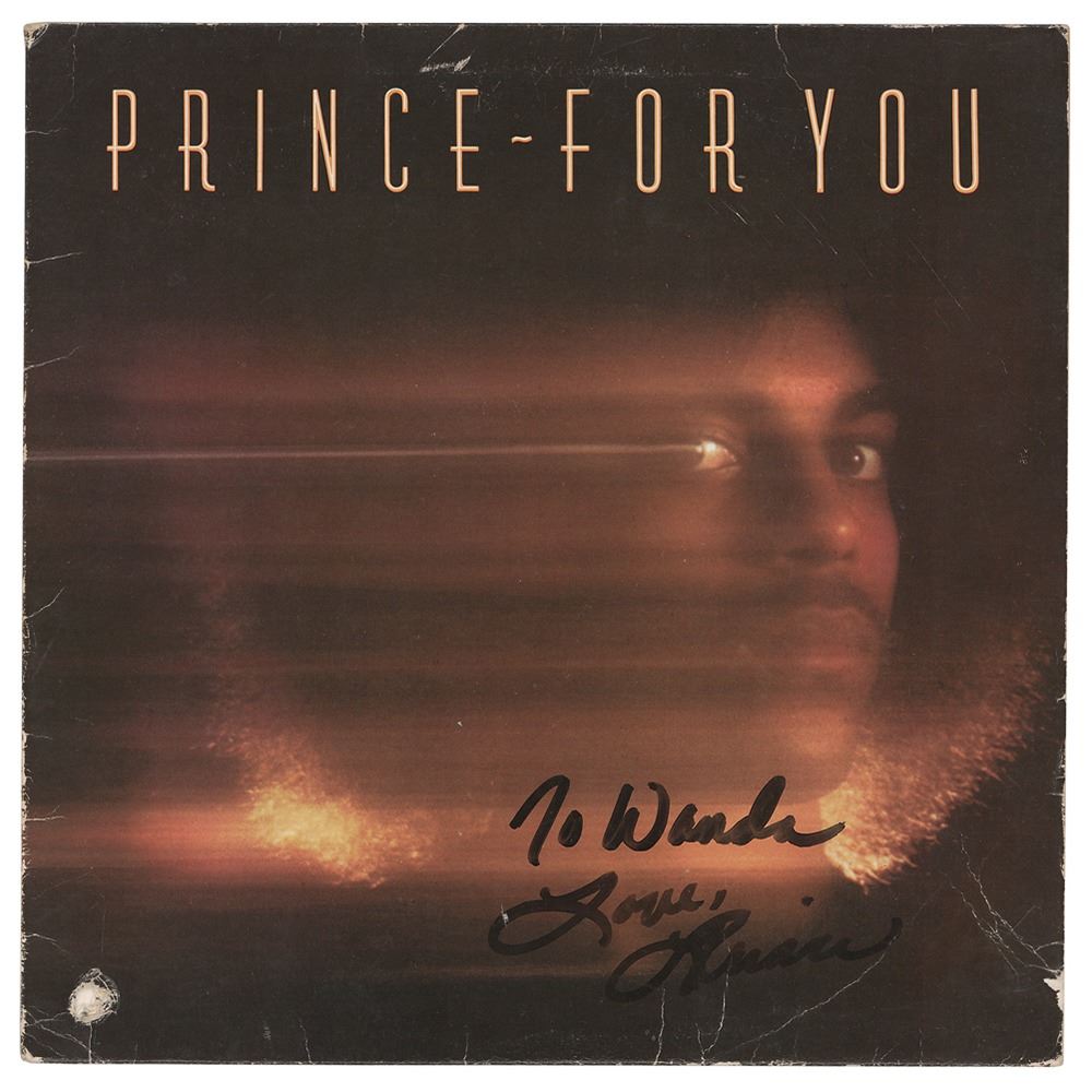 For You album by Prince, signed and inscribed on the front cover in black felt tip, "To Wanda, Love, Prince." In very good to fine condition, with creasing to the edges and corners, and a hole to the lower left corner. The record is included. Accompanied by a full letter of authenticity from PSA/DNA. A very desirable and quite rare signed example of Prince's debut album.