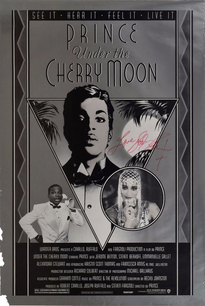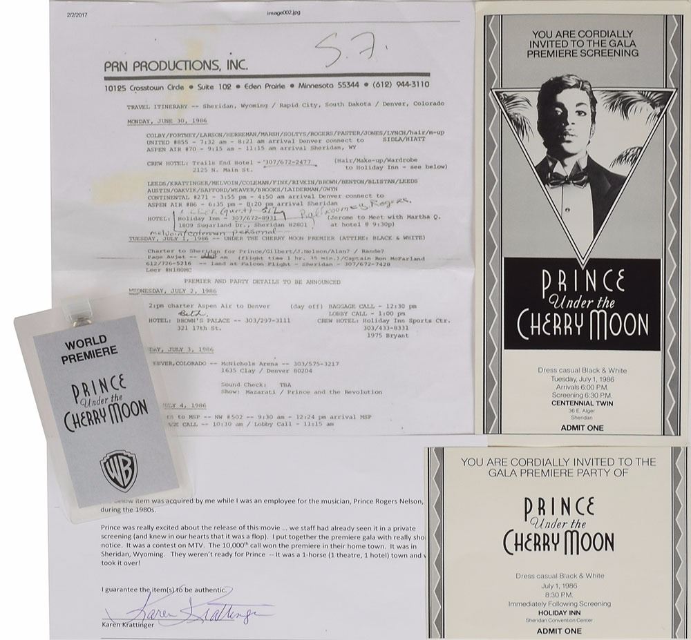 Sought-after silver-toned 27 x 40.25 poster for the 1986 film Under the Cherry Moon, signed in red felt tip, "Love God, Prince," who adds a cross below. Also includes an invitation to the world premiere of the film at the Centennial Theater in Sheridan, Wyoming, on July 1, 1986; an invitation to the premiere after party at the Holiday Inn in the Sheridan Convention Center; a laminated Warner Brothers badge for the film premiere; and a copy of the PRN Productions itinerary for the movie premiere. Rolled and in fine condition, with creasing and paper loss to the edges, easily matted out. Accompanied by a letter of provenance from PRN general manager Karen Krattinger, in part: "The…item was acquired by me while I was an employee for the musician, Prince Rogers Nelson, during the 1980s. Prince was really excited about the release of this movie…I put together the premiere gala with really short notice. It was a contest on MTV. The 10,000th call won the premiere in their home town. It was in Sheridan, Wyoming. They weren't ready for Prince—It was a 1-horse (1 theatre, 1 hotel) town and we took it over!" A magnificent display piece boasting a large Prince signature.