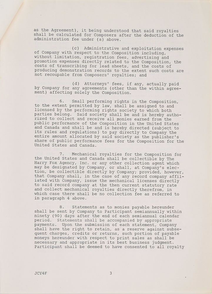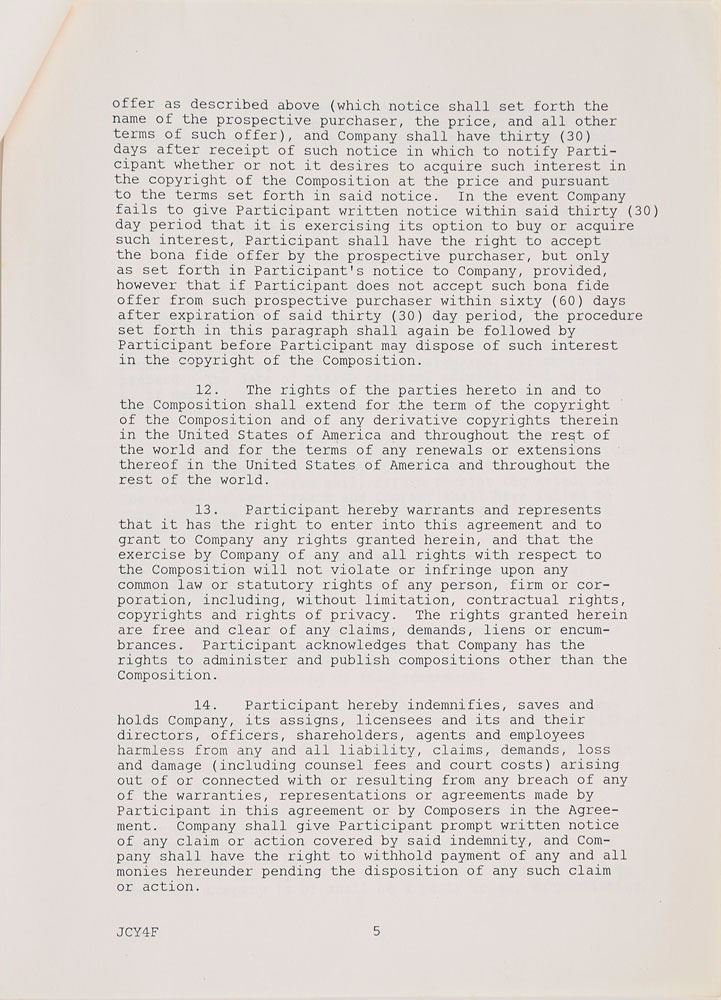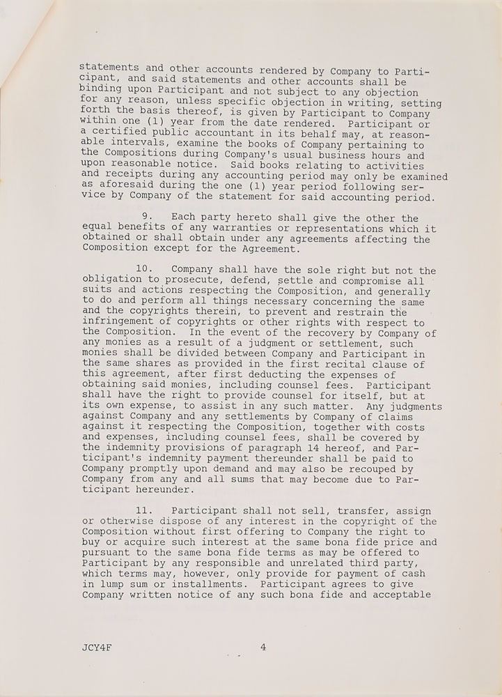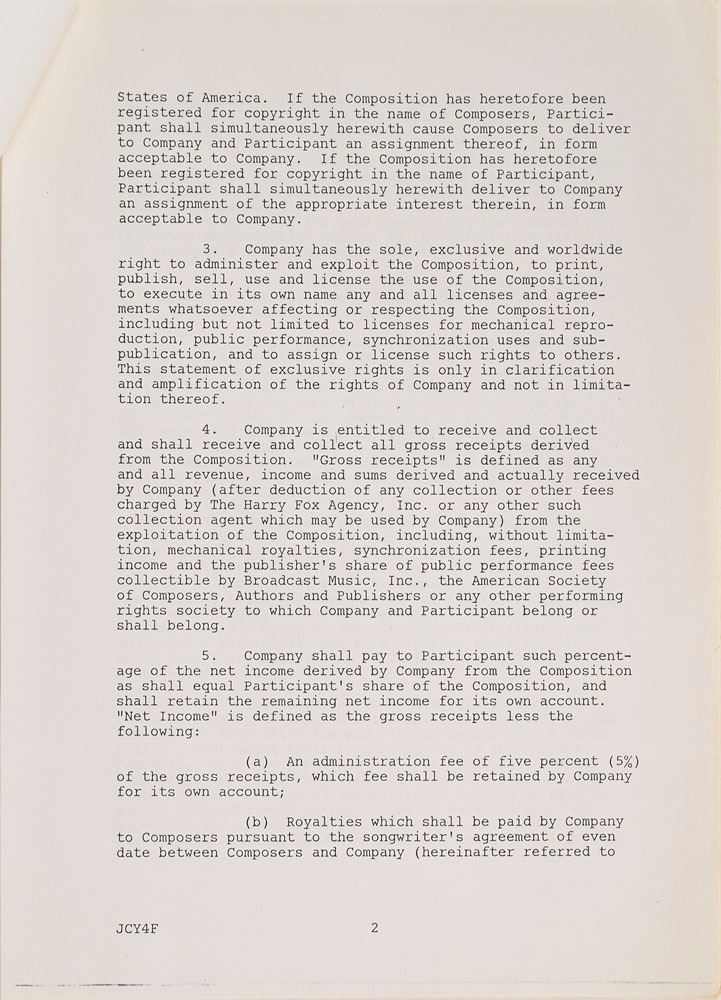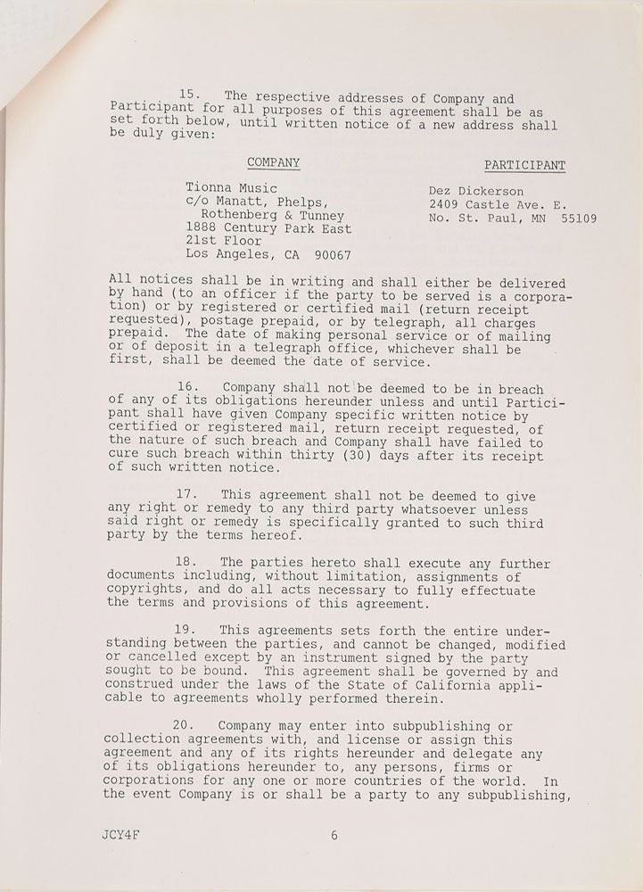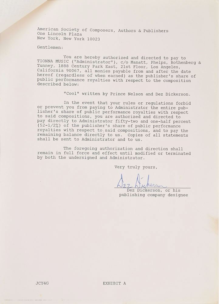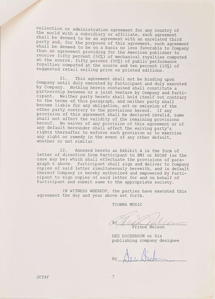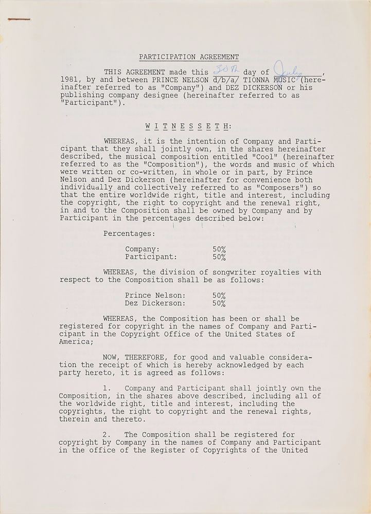 DS, signed “Prince Nelson,” seven pages, 8.5 x 11, July 30, 1981. Participation agreement between Prince's Tionna Music and Dez Dickerson, in which "they shall jointly own…the musical composition entitled 'Cool'…the words and music of which were written or co-written, in whole or in part, by Prince Nelson and Dez Dickerson." Signed at the conclusion in black ballpoint by Prince, and countersigned in blue ballpoint by Dickerson. Stapled to the contract is a one-page Exhibit ‘A’ document issued to the American Society of Composers, Authors & Publishers, also signed at the conclusion in blue ballpoint by Dickerson. In fine condition. From the collection of an early Prince insider.