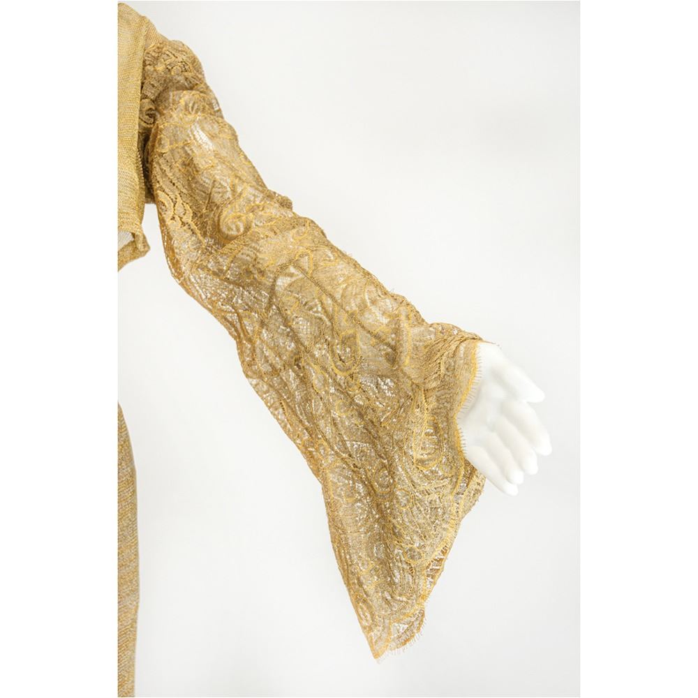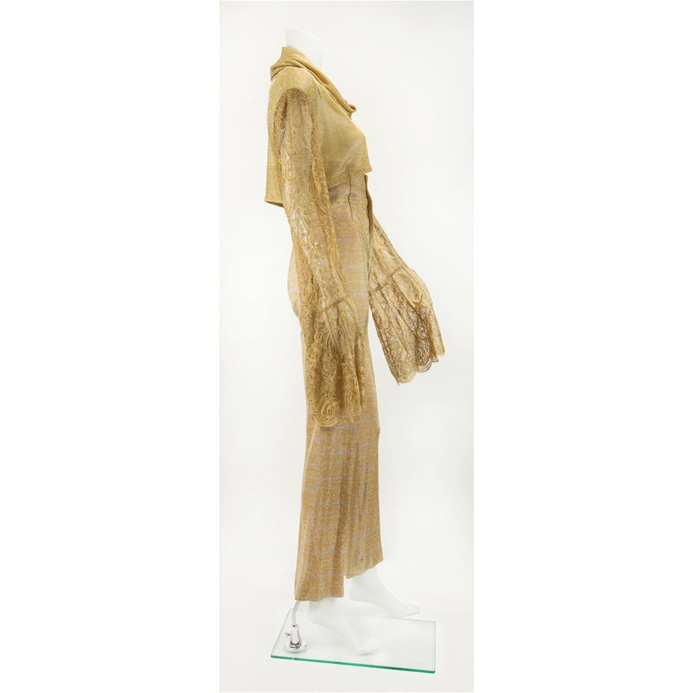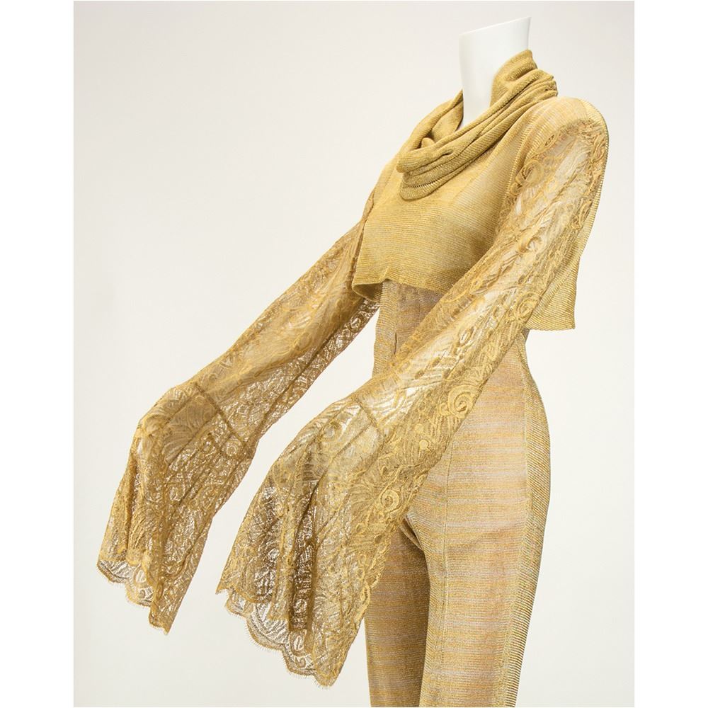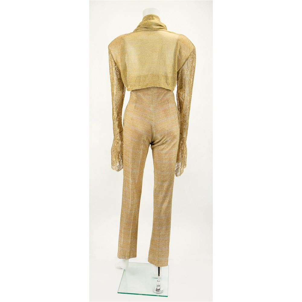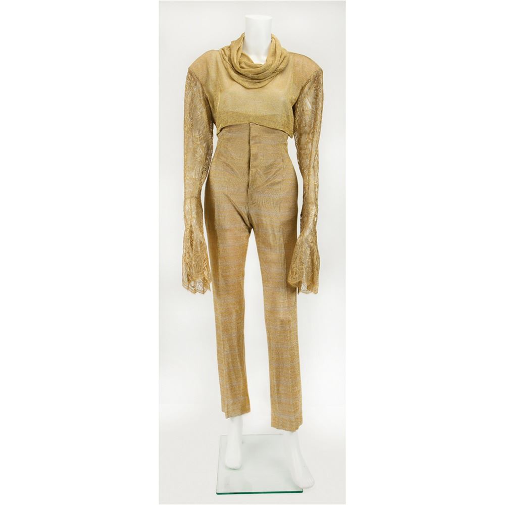 Custom-made gold outfit worn on stage by Prince during the 1997–1998 Jam of the Year World Tour, which consists of a crop top with cowl neck, padded shoulders, and long sheer sleeves embellished with large musical treble clefs patterns; and matching high-waist slacks with front clasp, side pockets, and built-in stirrups. In fine condition. Accompanied by a certificate of authenticity signed by Prince’s former wife, Mayte Garcia, who states that this “gold stage outfit was worn by Prince for the Jam of the Year World Tour.”