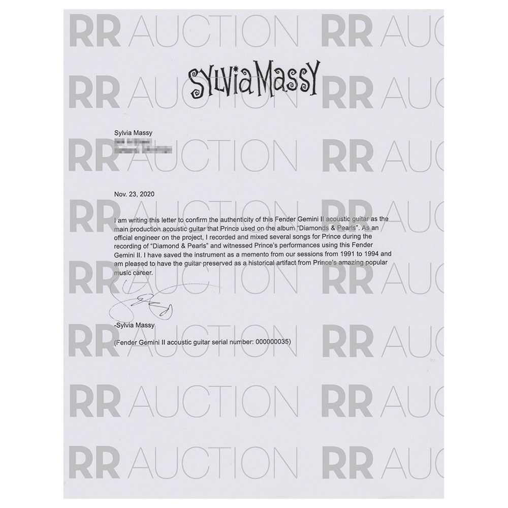 Accompanied by a signed letter of authenticity from acclaimed record producer, mixer, and engineer Sylvia Massy, who was one of several engineers who worked with Prince on Diamonds and Pearls. It reads: “I am writing this letter to confirm the authenticity of this Fender Gemini II acoustic guitar as the main production acoustic that Prince used on the album 'Diamonds and Pearls.’ As an official engineer on the project, I recorded and mixed several songs during the recording of 'Diamonds and Pearls' and witnessed Prince's performances using this Fender Gemini II. I have saved the instrument as a memento from our sessions from 1991 to 1994 and am pleased to have the guitar preserved as a historical artifact from Prince's amazing popular musical career.’