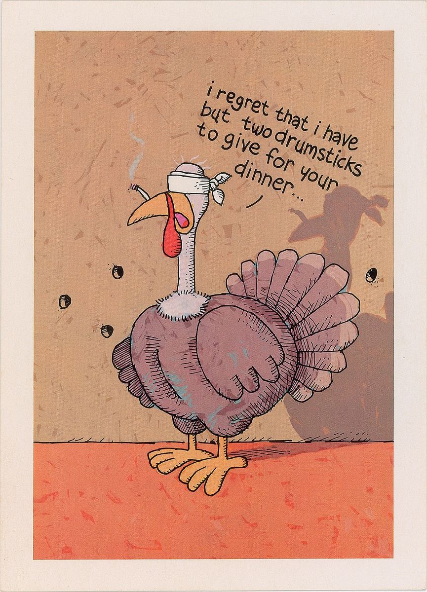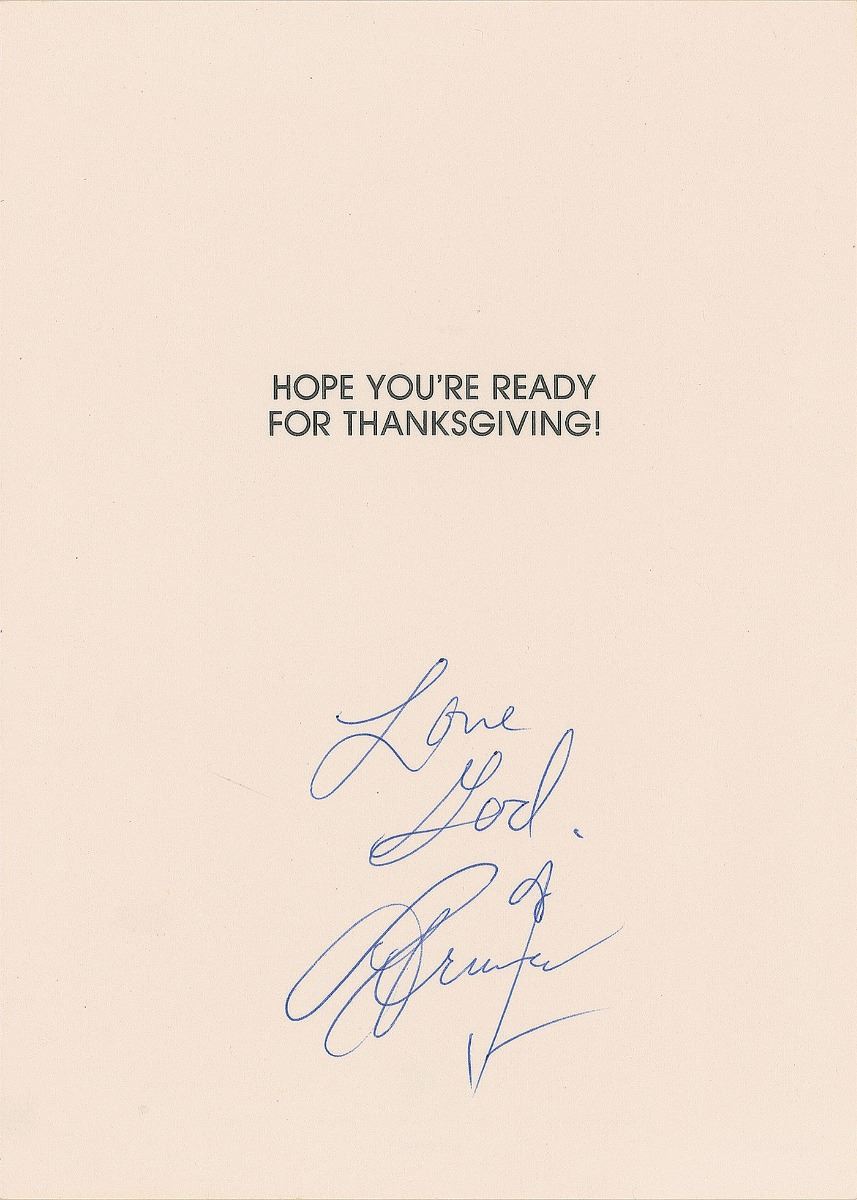 Thanksgiving card from 1984 featuring a blindfolded turkey smoking a cigarette against a bullet-riddled wall, measuring 10 x 7 open, signed inside below a printed greeting in blue ballpoint, “Love God, Prince.” In fine condition. Consignor notes that Prince sent this card—originally filled with a $100 bonus—while he was on the Purple Rain Tour.