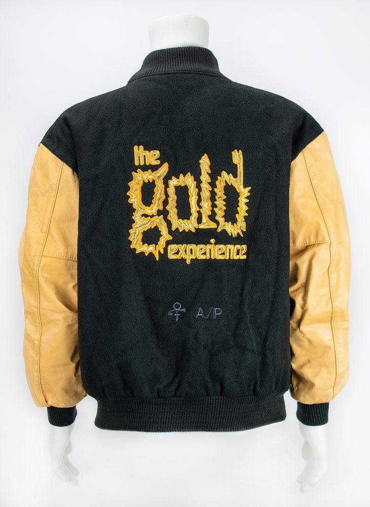 Varsity-style 'The Gold Experience’ tour jacket, size L, with Steer Brand label to inner collar, black wool body, beige leather sleeves, and knit cuffs, collar, and waistband. The left and right chest is stitched with gold and black lettering, "NPG Records, 1995 Limited / rock ‘n’ roll is alive (and it lives in Minneapolis)," and the back is prominently embroidered with bright gold thread: "the gold experience,” with lower “A/P” and Prince ‘Love Symbol’ in black stitching. In fine condition.