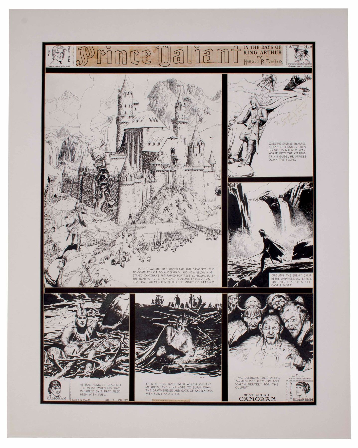 One of the greatest pieces of artwork by Hal Foster in his career, the original artwork for the 120th ''Prince Valiant'' Sunday comic strip from 28 May 1939. In this instantly recognizable piece -- featured on the cover of Fantagraphics' ''Prince Valiant Vol. 2: 1939-1940'' and in numerous ''Prince Valiant'' publications -- Val sees the foreboding castle of Andelkrag in person, surrounded by Huns as they prepare to attack it. The six panel strip measures 26'' x 34.5'', (the large Andelkrag panel measures 17'' x 21'' by itself), with incredible detail showing the seemingly impregnable fortress, the mountains behind it, the flames roiling up aside it and Prince Valiant standing upon a hillside, gazing at its beauty and enormity. In this strip, Val makes his approach and plunges into the river moat at darkness, to find a fire-raft built by the Huns in order to destroy Andelkrag's bridge. As Prince Valiant destroys their handiwork, the Huns vow revenge in return. Artwork is signed by Foster on the second panel, inscribed to ''Edward W. Larson / with friendly greetings / Hal Foster''. With King Features Syndicate, Inc. label on fifth panel, with 1939 copyright. The date of 28 May 1939 appears on the fourth panel, along with ''120'', the number of this Prince Valiant strip in the life of the series. Artwork is mounted to board and matted to a size of 33'' x 41.5'', with matting strips separating the panels. With minute amount of soiling, artwork is in near fine condition. Accompanied by the color newsprint of this artwork and two ''Prince Valiant'' books featuring this strip.
