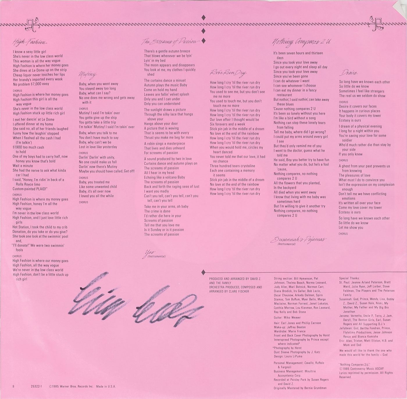 Collection of four items related to The Family from the collection of saxophonist Eric Leeds: an original pressing of The Family's only album, The Family (Paisley Park/WB 25322), which yielded the hit single 'Screams of Passion' and the original recording of 'Nothing Compares 2 U,' signed on the inner sleeve in black felt tip by Leeds; a sealed, unopened 'The Screams of Passion' 12? maxi-single (Paisley Park/WB 20360), featuring an extended version of 'Screams' backed with the LP version of 'Yes,' an instrumental song from The Family album; production call sheets for the music video of The Family's 'Screams of Passion,' shot in Los Angeles on June 3–4, 1985, including all band and personnel information, production info, maps of locations, and call times; a program for the 1st Annual Family Jamm! 2003, a benefit concert for the L'il Angel Bunnies Foundation, signed inside in black ballpoint by Leeds; and a tentative rehearsal schedule and show order for the 2003 Family Jamm! concert. In overall fine condition. The Family was Eric Leeds's first project with Prince. From the collection of musician/saxophonist Eric Leeds and accompanied by a letter of provenance.