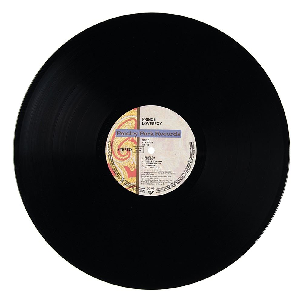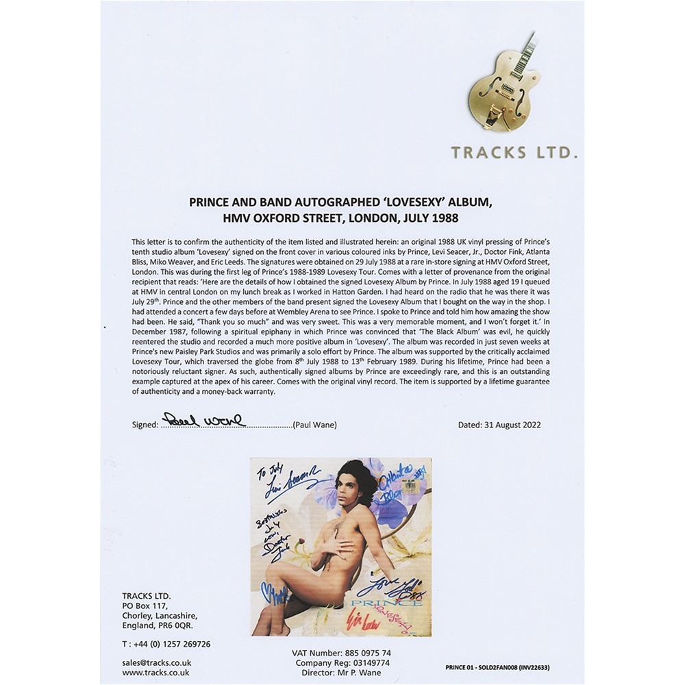 Accompanied by a certificate of authenticity from Tracks, a modern color 6 x 4 photo of Prince arriving at the HMV signing, and a letter of provenance from the original recipient, which reads: “Here are the details of how I obtained the signed Lovesexy Album by Prince. In July 1988 aged 19 I queued at HMV in central London on my lunch break as I worked in Hatton Garden. I had heard on the radio that he was there it was July 29th. Prince and the other members of the band present signed the Lovesexy Album that I bought on the way in the shop. I had attended a concert a few days before at Wembley Arena to see Prince. I spoke to Prince and told him how amazing the show had been. He said ‘Thank you so much’ and was very sweet. This was a very memorable moment and I won’t forget it.”