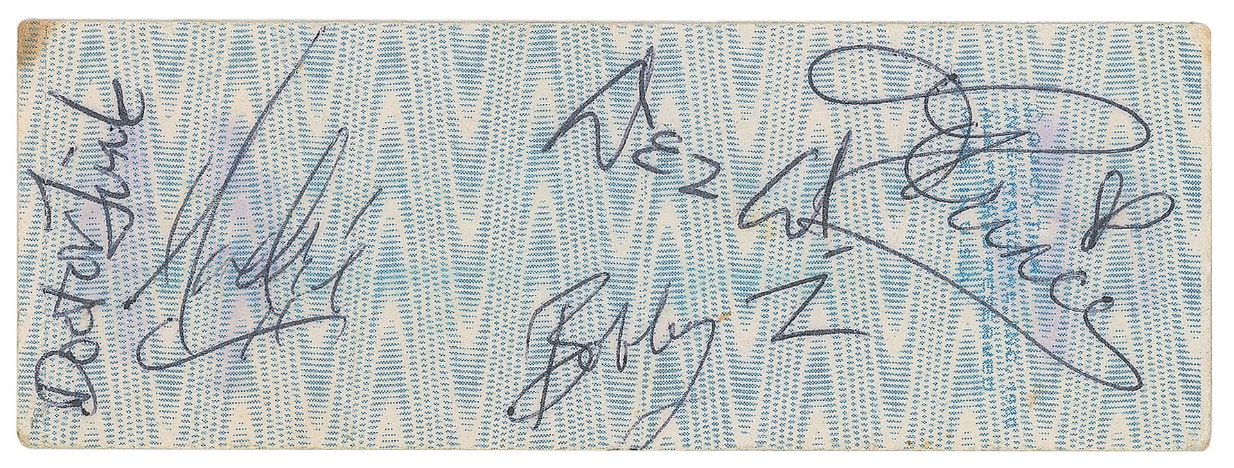 Sought-after ballpoint signatures, "Prince," "Dez D.," "Bobby Z.," "Andre," and "Doctor Fink," on the reverse of a 4.25 x 1.5 concert ticket issued by promoter Steve Myers. In fine condition, with one tiny corner stain.
