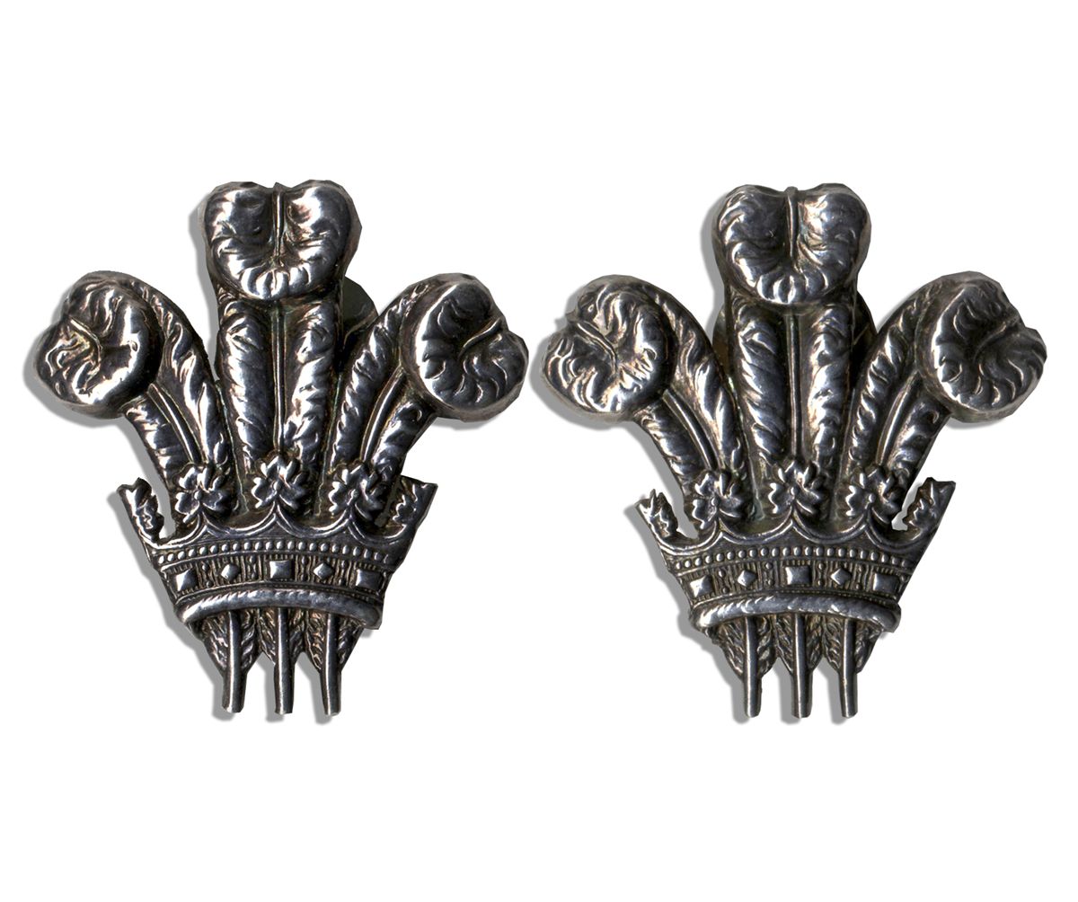 Prince of Wales feathers earrings owned by the Duke and Duchess of Windsor. Pair of shiny earrings in polished silver or pewter tone metal feature clip-on closures. Each measures 1'' x 1.25''. Near fine. Provenance from the Sotheby's auction of The Jewels of the Duchess of Windsor, held Geneva, Friday 3rd April 1987, Lot 104.