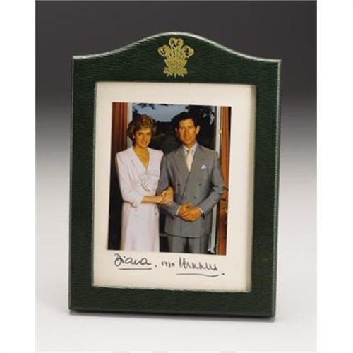 <B>Prince of Wales Presentation Frame with Signed Original Photograph of Prince Charles and Princess Diana</B></I><BR><I>Signed</B></I> <I>Diana 1990</B></I> <I>Charles</B></I> <BR><BR>Showing the Prince and Princess of Wales standing together, her arm linked around his, within a textured green rectangular frame, the domed top embossed with Prince of Wales Feathers in gold-the frame- 9 1/2 x 7 in. ; photograph-5 x 4 in.<BR><BR>Provenance: <BR>Commissioned by the Prince and Princess of Wales as a presentation gift <BR>Purchased from Hope & Glory, London<BR><BR><BR><BR><b>Shipping:</b> Requires 3rd Party Shipping (<a target="_blank" href="http://www.heritageauctions.com/common/shipping.php">view shipping information</a>)