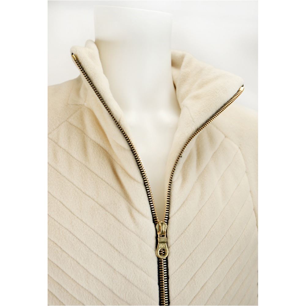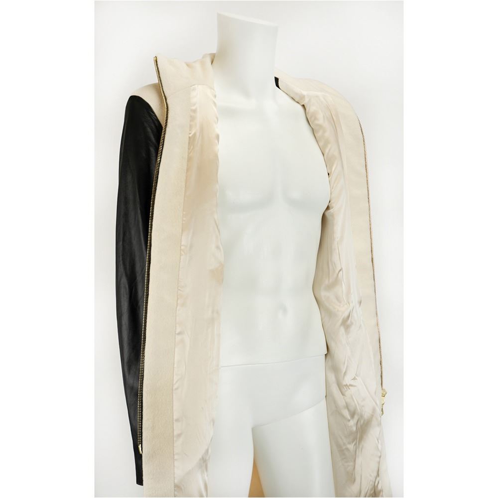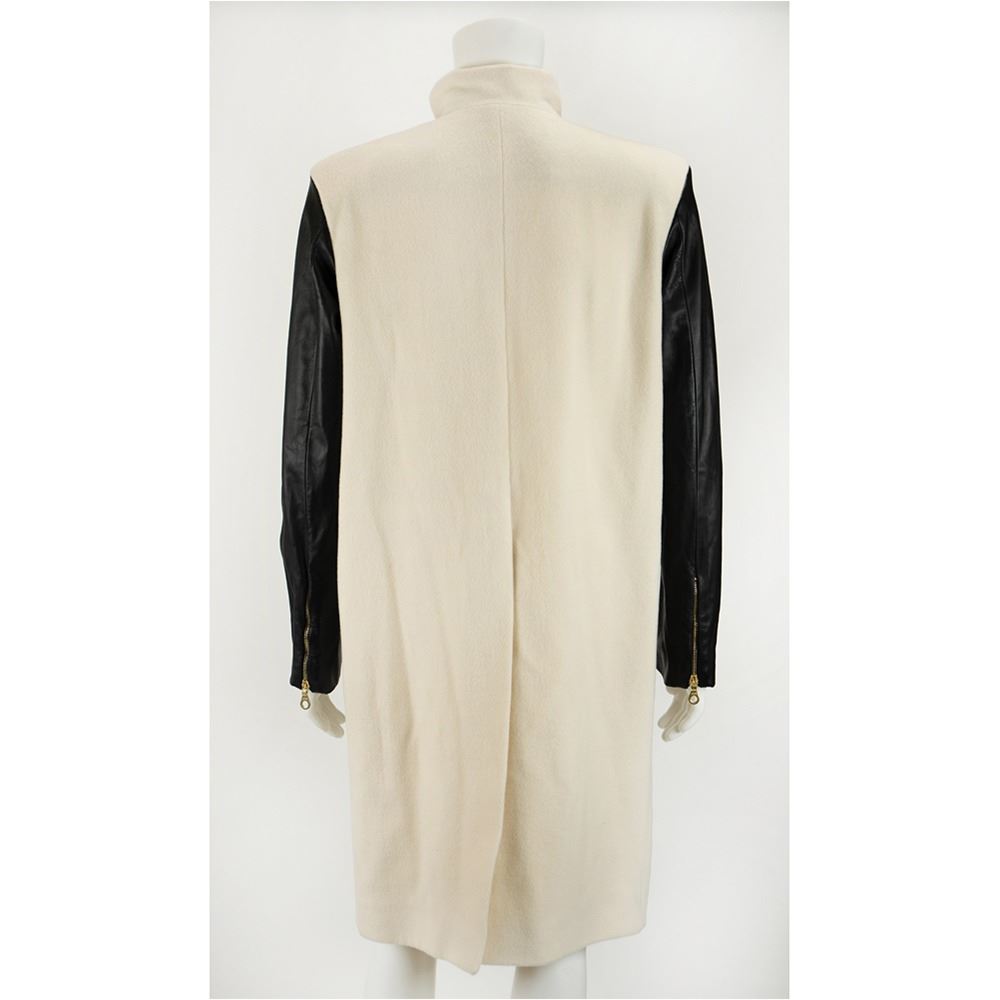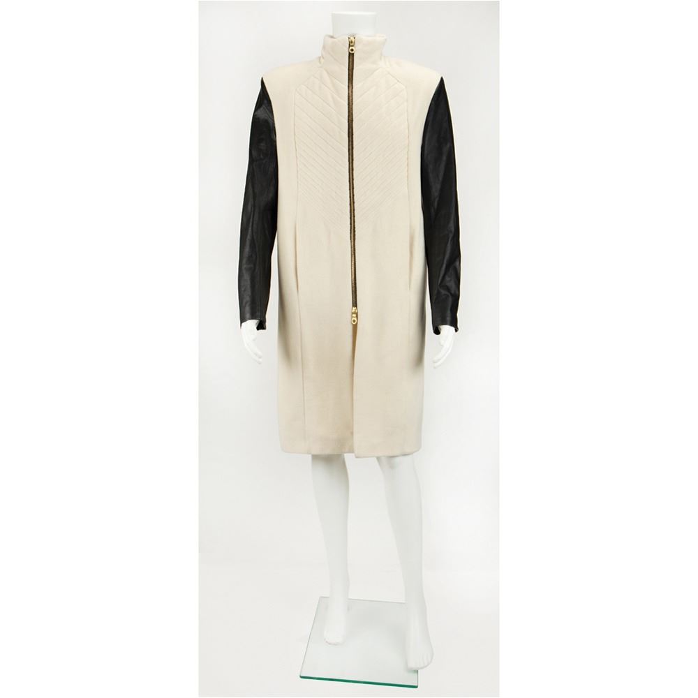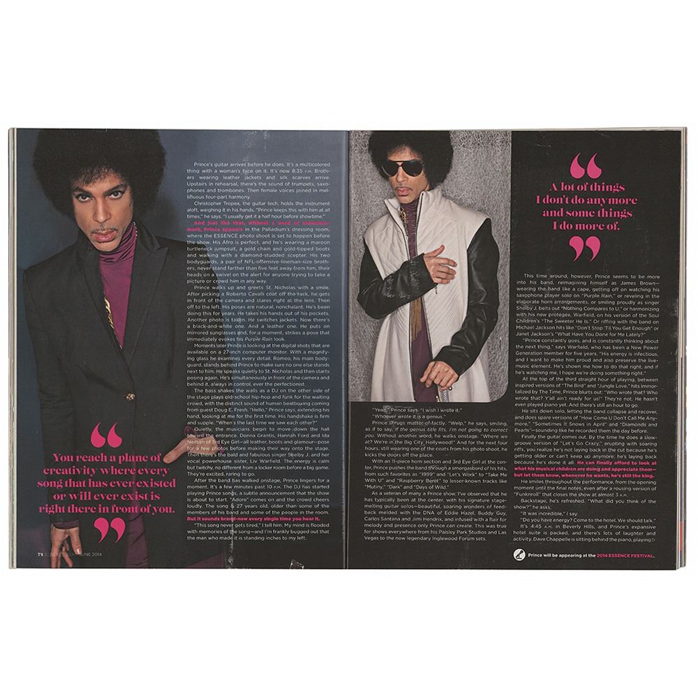 Prince's personally-worn long white cashmere trench coat by Ashton Michael, from a photo shoot for the June 2014 issue of Essence magazine. The fine white cashmere wool coat features a simple sewn-in chevron design, two slit pockets, a single vent on the back, and a golden zipper on the front; the arms are fine black leather with golden zippers on the wrists. The inside is lined in white satin and has the "Ashton Michael" tag inside the neck. In fine condition. Accompanied by a letter of provenance from the designer, in part: "This certifies that the purchased item is authentic Ashton Michael Inc. 'Black Heart Collection' worn by the artist formerly known as 'Prince' for the 2014 editorial feature in Essence Magazine. The garment is sold 'as is' with natural wear from the artist." Also includes the complete June 2014 issue of Essence, which features Prince on the cover; he is seen wearing this jacket on page 75.