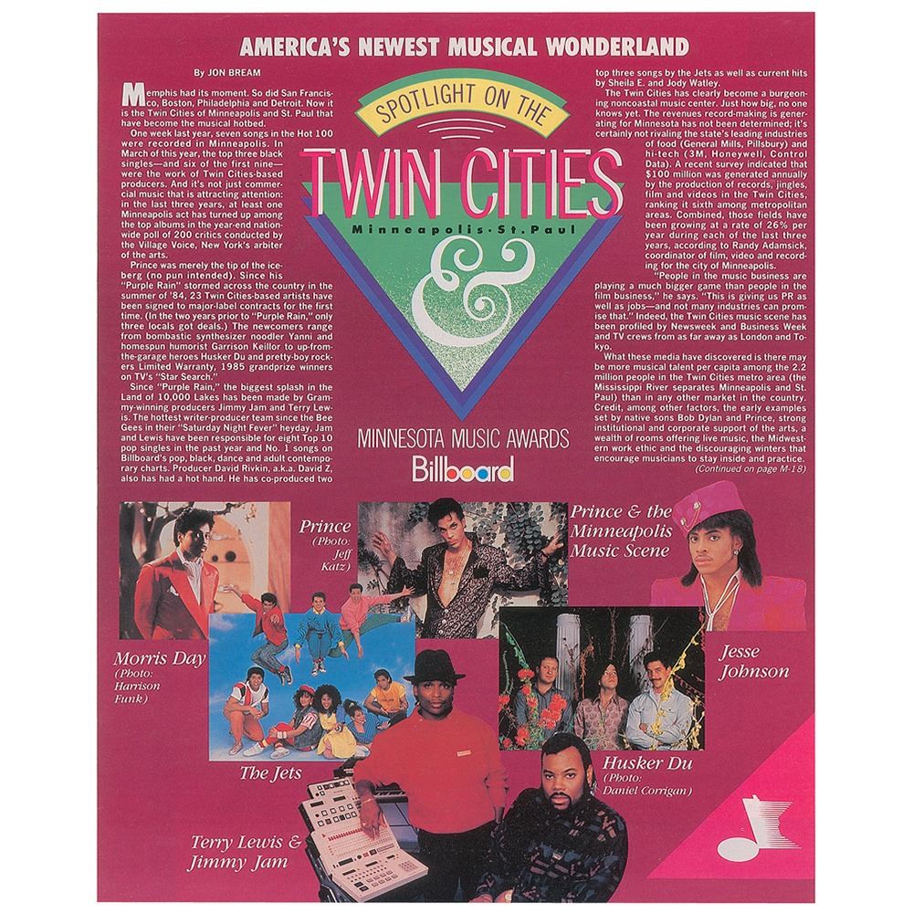 Prince's personal copy of the sought-after issue of Billboard magazine from April 25, 1987, 88 pages, 11 x 13.5, with front cover showing a fabulous image of a bespectacled Prince with white header text, "Prince and the Minneapolis Music Scene." In fine condition. From the collection of Prince's assistant Therese Stoulil and accompanied by a letter of provenance.