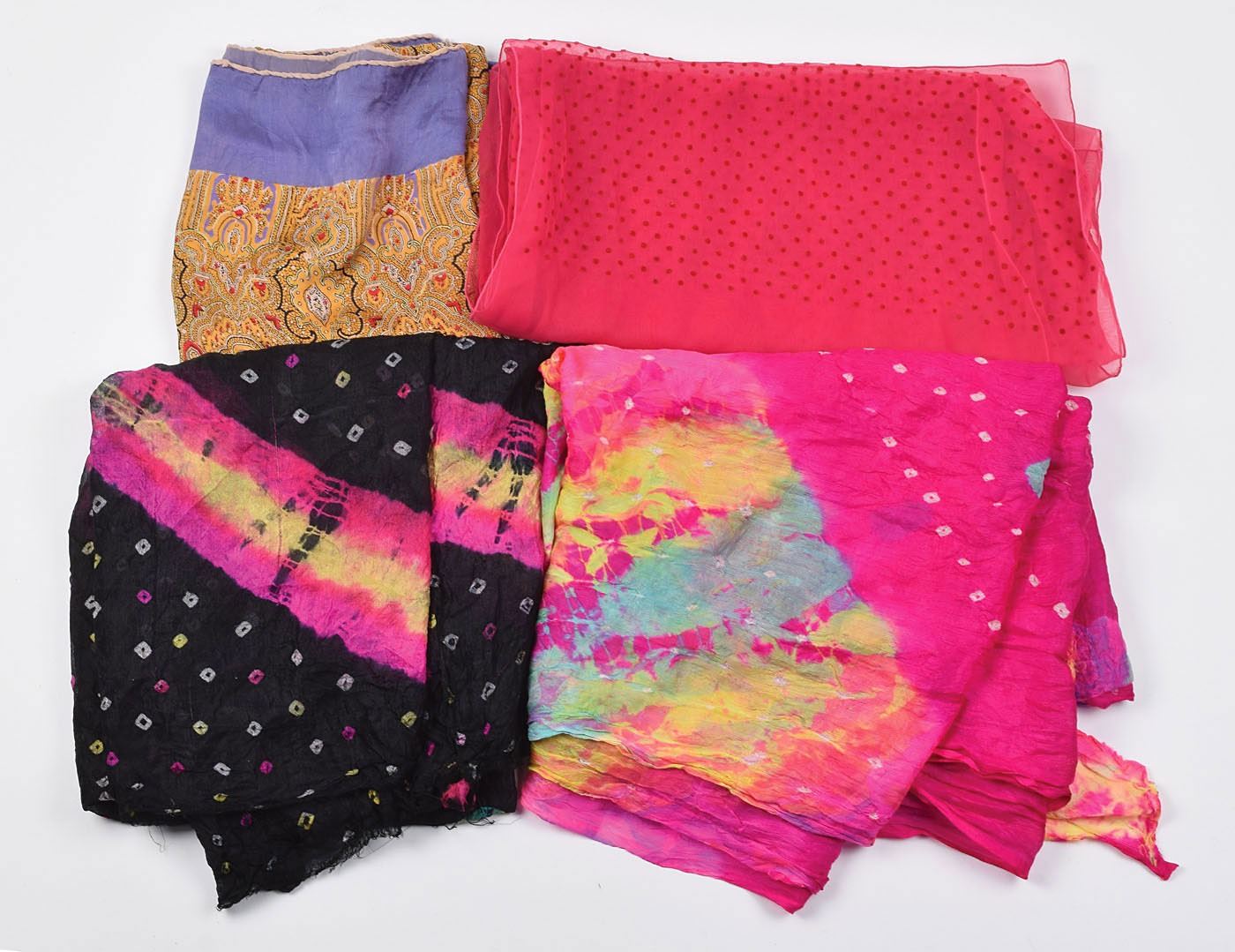 Group of four of Prince's personally-owned cloths and scarves used to decorate his bedroom in his chic Avenue Foch apartment in Paris, including three made of silk. These include: a 60 x 14 length of sheer pink fabric with sections of red tufted polka dots; a 30 x 30 blue-and-gold silk featuring an ornate printed pattern in the center; an 80 x 34 fuschia-and-green silk with a tie-dye diamond pattern; and an 80 x 36 black, pink, and yellow silk with a similar design. In overall very good to fine condition, with some fraying. From the collection of Prince’s Parisian assistant Sophie Roux, who notes that Prince wanted his bedroom decorated in a Bohemian style with fabrics covering furniture and draped from the ceiling.