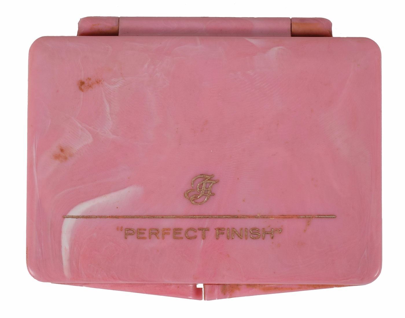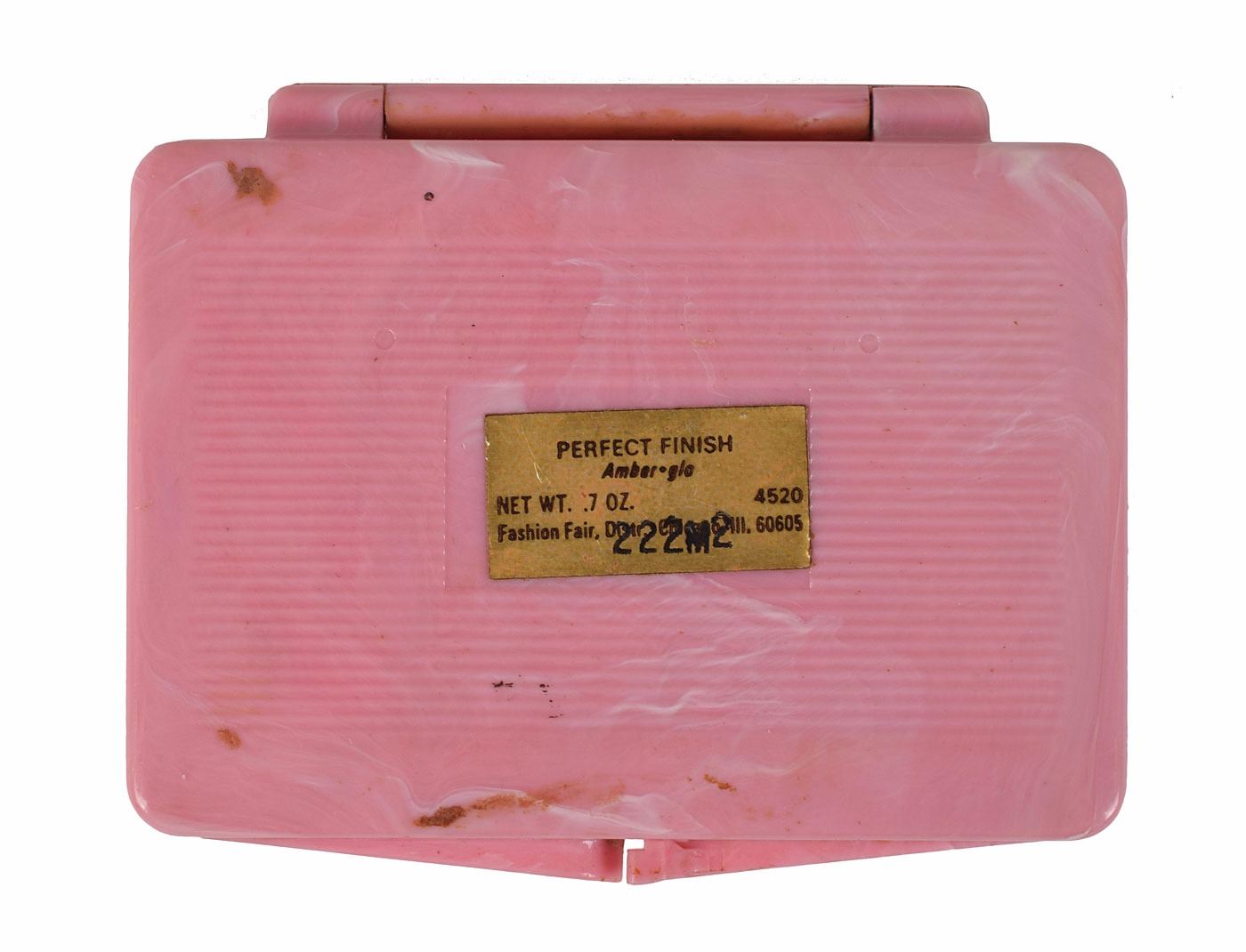 Prince's personally-owned and -used pink Fashion Fair "Perfect Finish" makeup compact, containing "Amber Glo" creme makeup and a mirror. In very good to fine condition, with expected wear from use. From the collection of an early Prince insider. Prince famously wore makeup both on stage and off, and this "Amber Glo" must have been perfect for his fair caramel complexion.