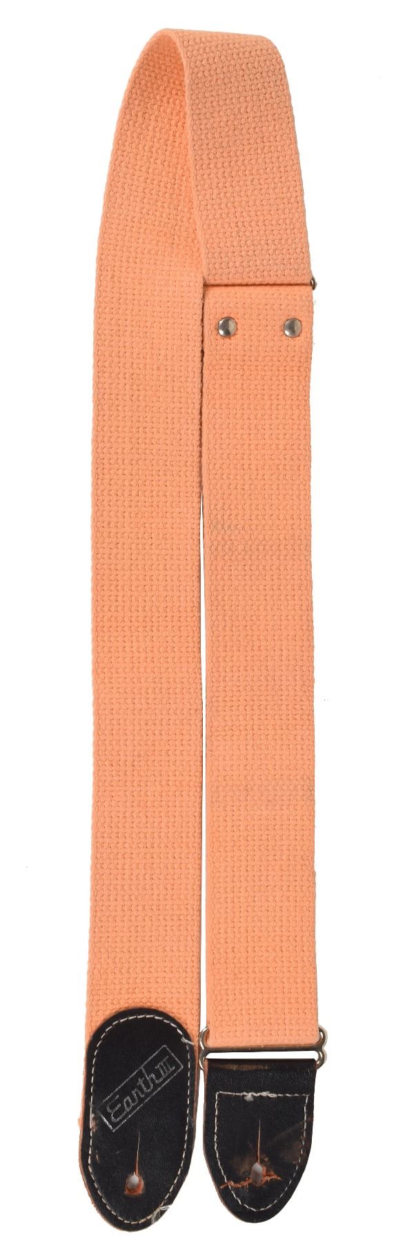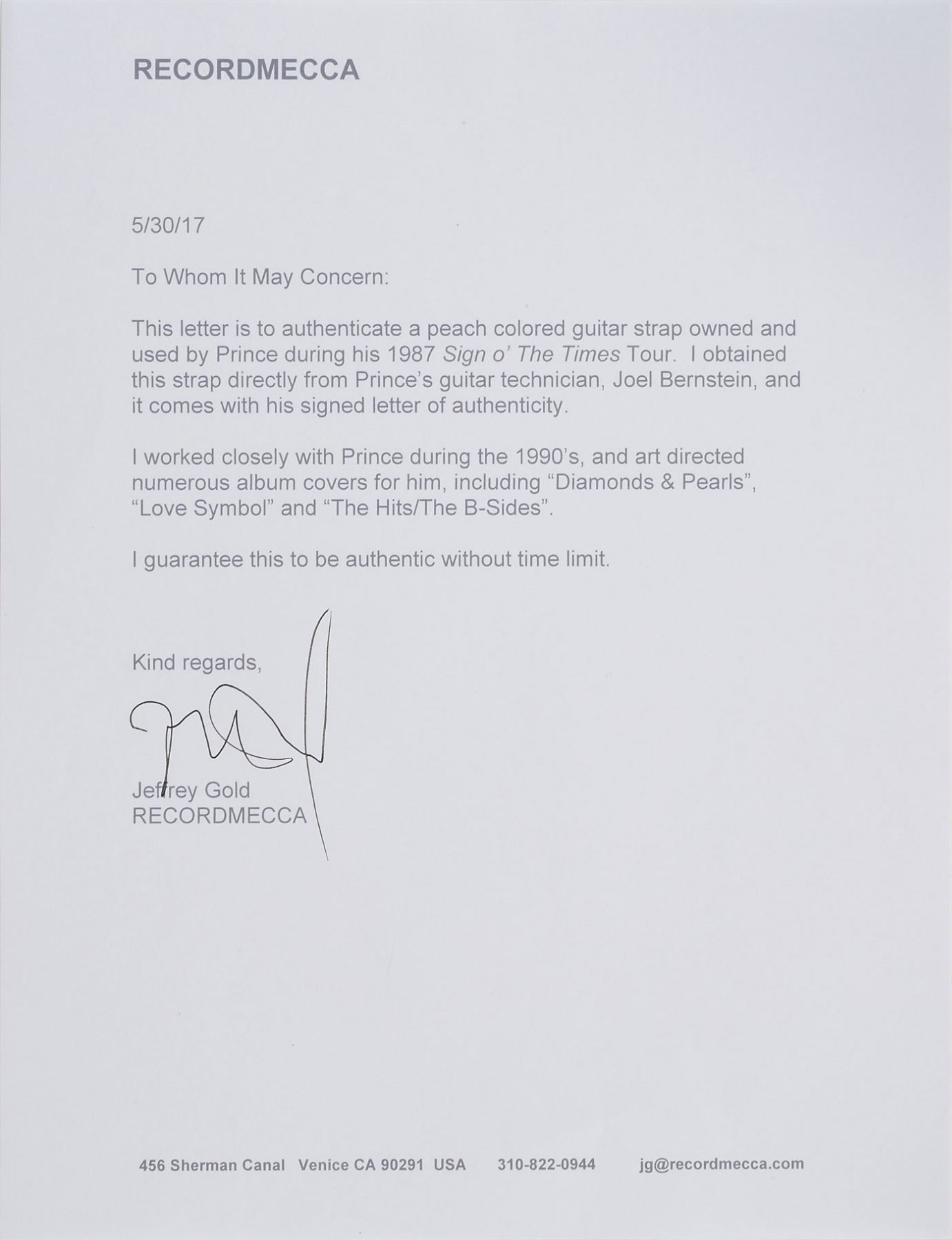 Prince’s personally-owned and -used peach-colored Earth III guitar strap used during the 1987 Sign o' the Times Tour, from the collection of Prince’s former guitar technician and occasional photographer Joel Bernstein. In fine condition, with wear to leather buckle consistent with heavy use. Accompanied by a letter of provenance from Bernstein, in full: "This letter is to authenticate a peach-colored guitar strap used on stage by Prince, during his 1987 Sign o’ The Times tour. Prince used two identical custom-made peach colored guitars during this tour, each one with an identical strap. From the evidence of use to this strap, I’d guess this was from the more heavily used guitar. This strap can be seen in use in many live videos and photographs, including the Sign o’ The Times concert film. I worked with Prince from 1987 through 1991, as his personal guitar technician for concerts and recording, and occasionally as his photographer. This period included Sign O’ The Times, Lovesexy, the Batman soundtrack, and My Name is Prince." Also includes a letter of authenticity from Jeff Gold, the owner of Recordmecca and a former executive vice president/general manager of Warner Bros. Records, who worked closely with Prince during the 1990’s, and art directed numerous album covers for him, including ‘Diamonds & Pearls,’ ’Love Symbol,’ and ‘The Hits/The B-Sides.’