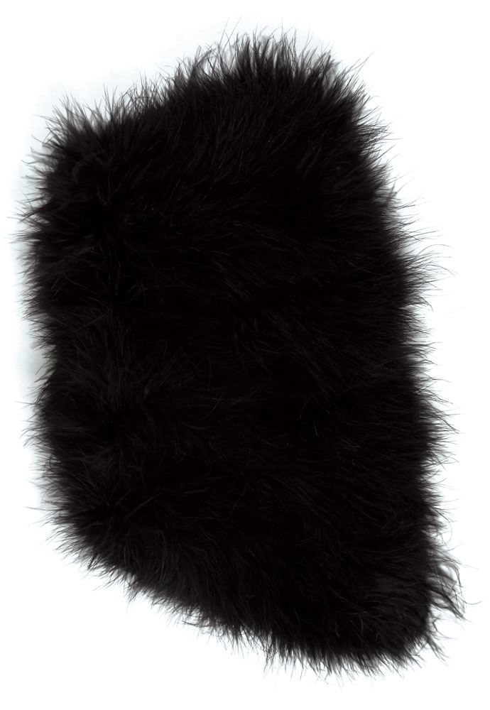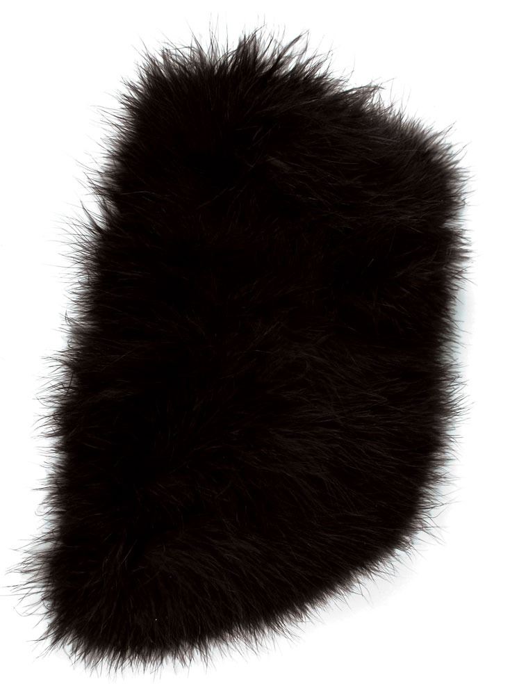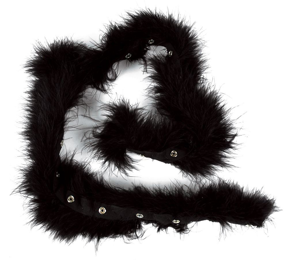 Prince's personally-owned and -worn black fur-like feathered muff and fabric strip. The cuff-type muff measures approximately 13 x 8 and the fabric strip measures 36? long. The muff has snaps at both ends and the backing of the strip is lined with snaps; the wardrobe department designed these so that they could be pieced together and interchanged for many different applications. In fine condition. Includes an image of Prince dressed in this type of material, which he would wear as capes and on his arms and legs as cuffs. From the collection of Prince's assistant Stachia Fiedler.