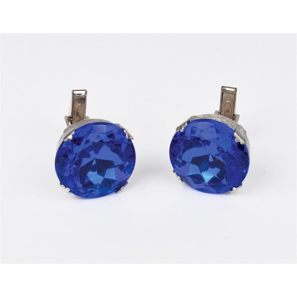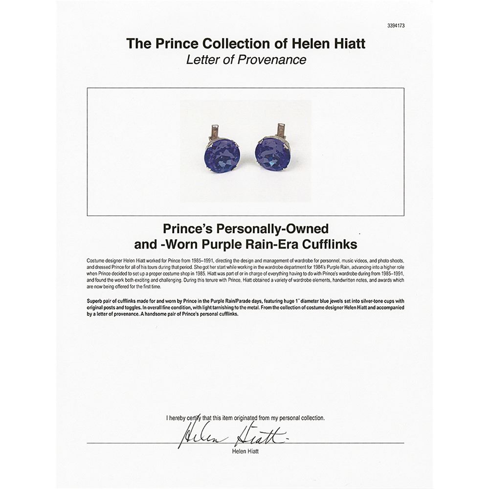 Superb pair of cufflinks made for and worn by Prince in the Purple Rain/Parade days, featuring huge 1˝ diameter blue jewels set into silver-tone cups with original posts and toggles. In overall fine condition, with light tarnishing to the metal. A handsome pair of Prince's personal cufflinks.