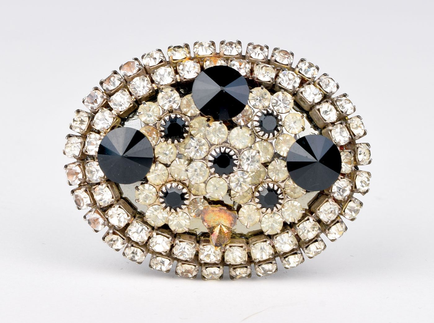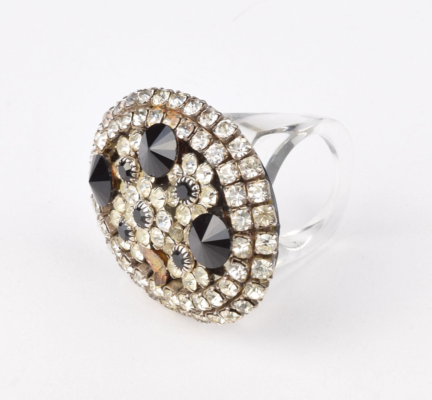 Prince's personally-owned and -worn big costume jewelry ring from the Lovesexy era, featuring a 1.75? x 1.5? face decorated with black and clear rhinestones, attached to a thick clear plastic ring. In fine condition, with one large black stone missing. From the collection of Prince’s Parisian assistant Sophie Roux.