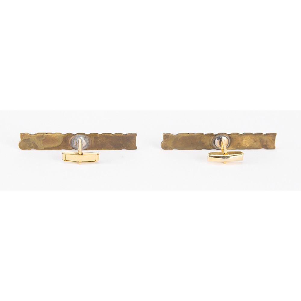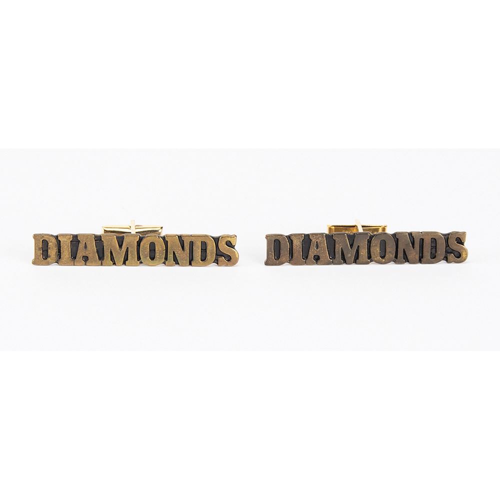 Handsome pair of Prince's personally-worn custom-made metal 'Diamonds' cufflinks, as worn by him on stage and in the 'Diamonds and Pearls' music video. The gold-and-black "Diamonds" cufflinks measure 2.5″ long, and have swivel toggle backs. In fine condition. From the collection of Prince's assistant Therese Stoulil and accompanied by a letter of provenance.