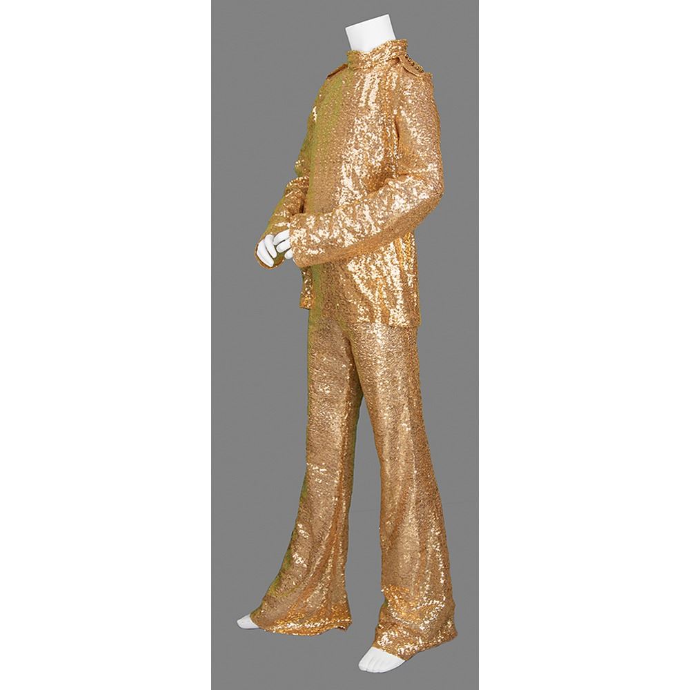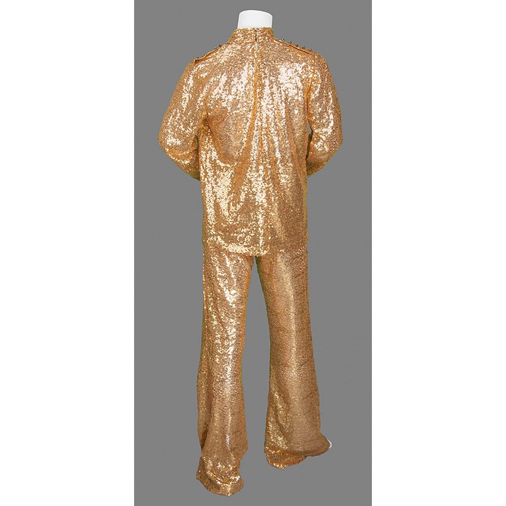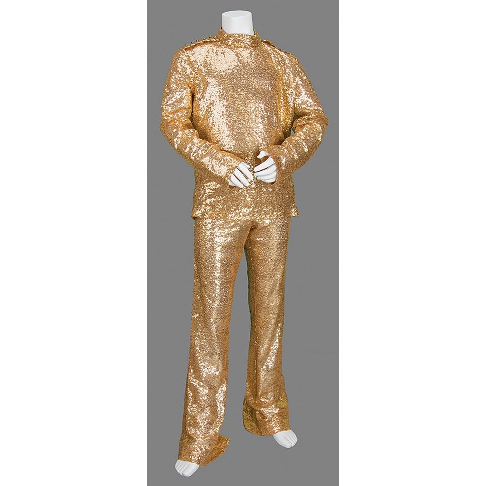 Prince’s personally-owned and -worn two-piece gold sequin suit, comprising a long-sleeved top with short standing collar and a matching pair of bell-bottom pants. Both are made of a fine, sheer fabric decorated over the entirety with glimmering golden sequins. Gorgeous beaded epaulets decorate both shoulders of the shirt. In fine condition, with minor wear from use. A stunning, well-crafted, and iconic piece from Prince's wardrobe.
