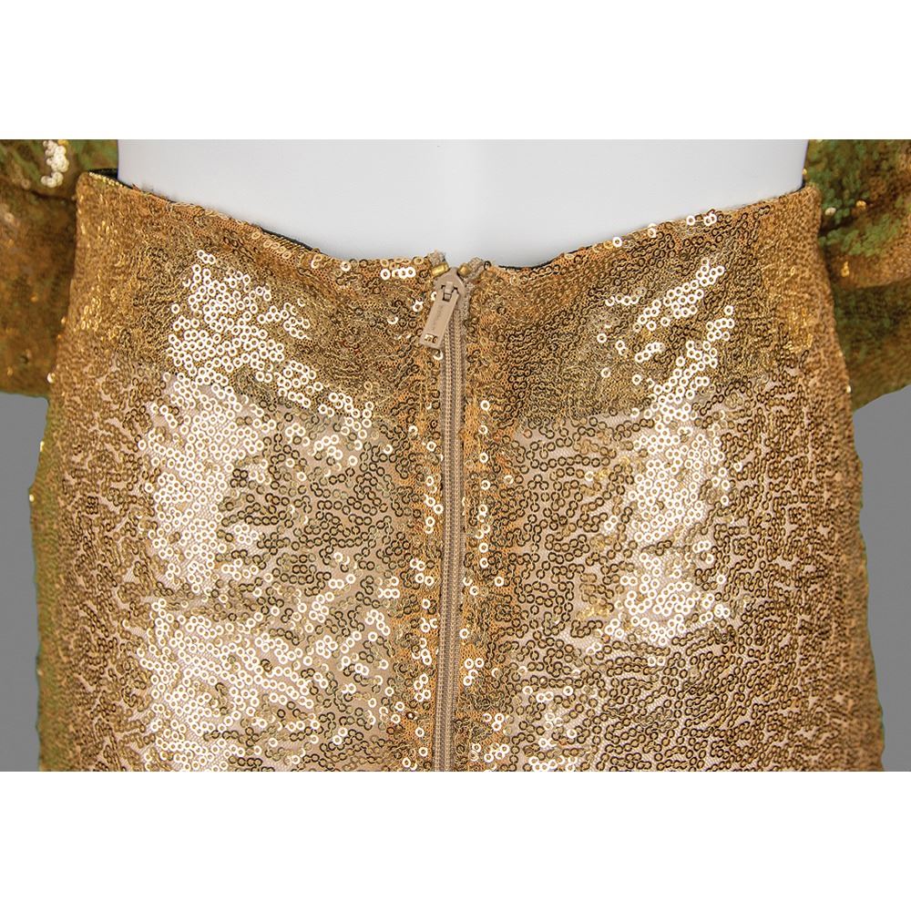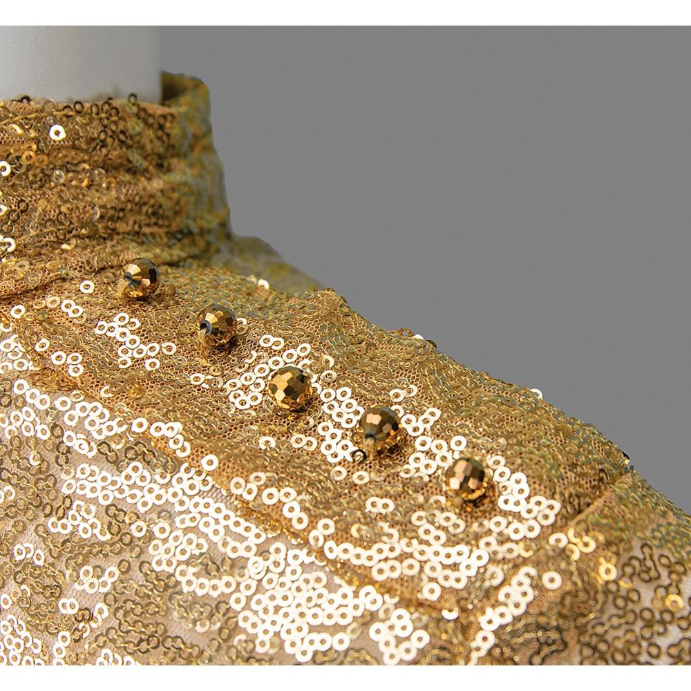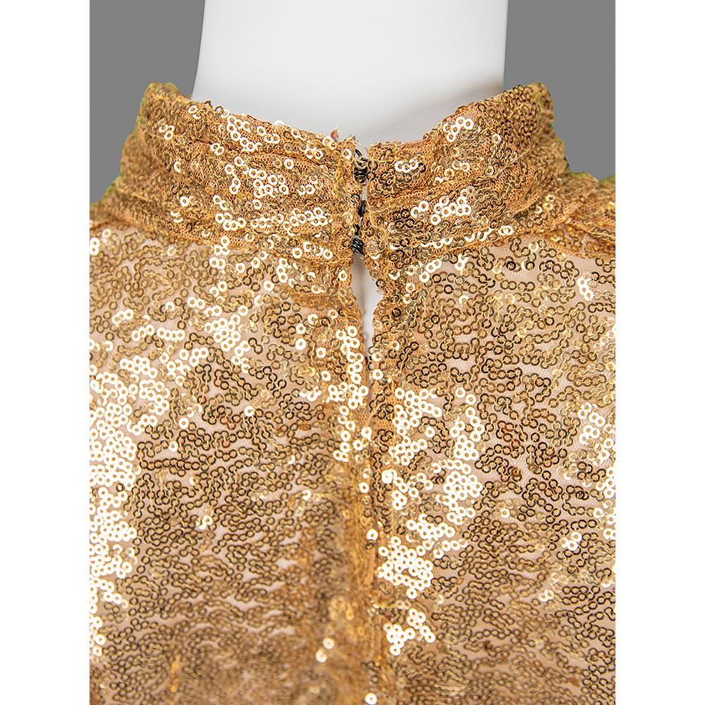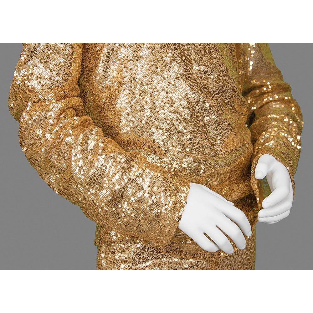 Prince’s personally-owned and -worn two-piece gold sequin suit, comprising a long-sleeved top with short standing collar and a matching pair of bell-bottom pants. Both are made of a fine, sheer fabric decorated over the entirety with glimmering golden sequins. Gorgeous beaded epaulets decorate both shoulders of the shirt. In fine condition, with minor wear from use. A stunning, well-crafted, and iconic piece from Prince's wardrobe.