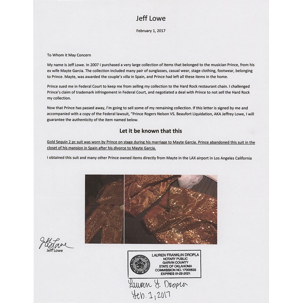Accompanied by a letter of provenance from Jeff Lowe (of Tiger King fame), stating that he acquired the jacket in 2007 from Prince's ex-wife Mayte Garcia. In part: "In 2007 I purchased a very large collection of items that belonged to the musician Prince, from his ex wife Mayte Garcia. The collection included many pair of sunglasses, casual wear, stage clothing, footwear, belonging to Prince. Mayte was awarded the couple's villa in Spain, and Prince had left all these items in the home…Let it be known that this Gold Sequin 2 pc suit was worn by Prince on stage during his marriage to Mayte Garcia. Prince abandoned this suit in the closet of his mansion in Spain after his divorce."