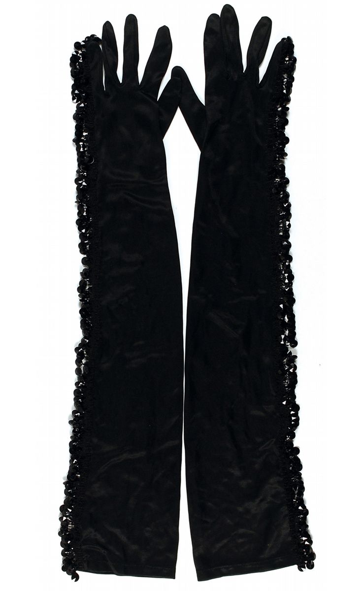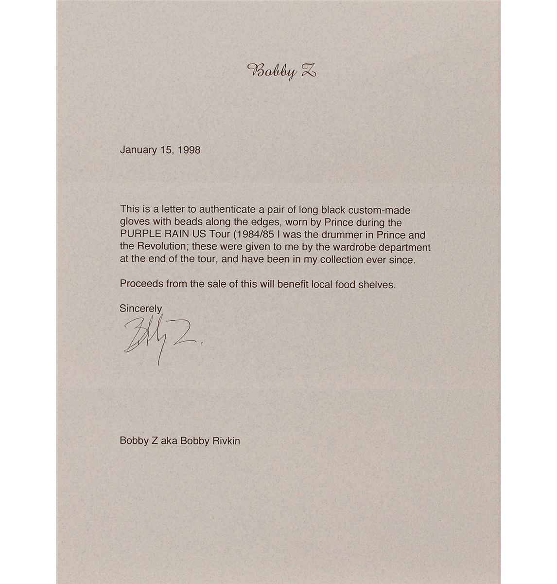 Pair of stage-worn custom-made long black gloves, worn by Prince during the Purple Rain tour in 1984–85. Gloves measure approximately 25” long and are adorned with black beads along one edge. Accompanied by a 1998 letter of provenance from the Revolution’s drummer Bobby Z which reads, in part: “This letter is to authenticate a pair of long black custom-made gloves…worn by Prince during the Purple Rain US tour…I was the drummer in Prince and the Revolution; these were given to me by the wardrobe department at the end of the tour.” In fine condition. Any stage-worn item from Price is quite rare, particularly as luxurious and dramatic as these gloves.