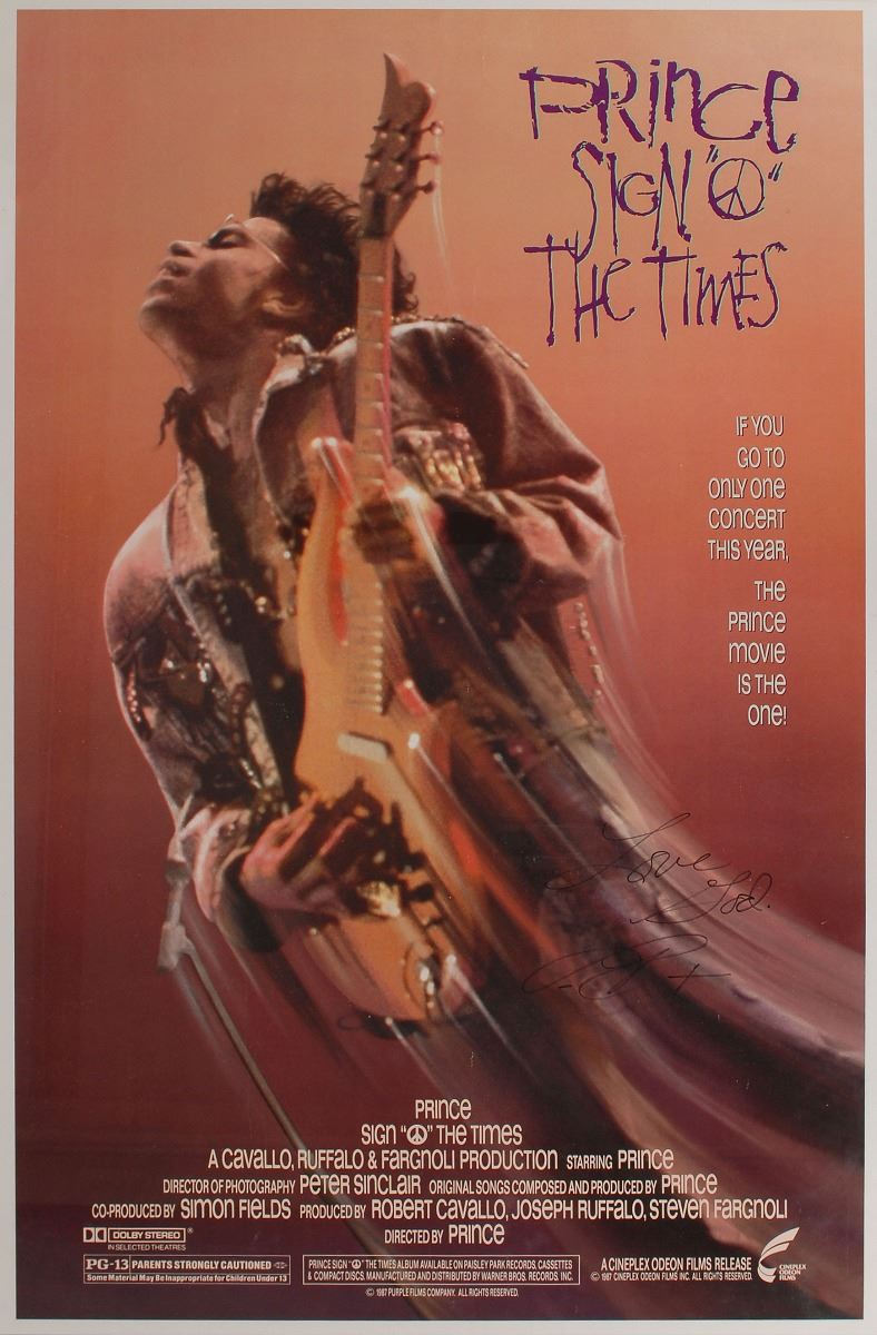 Incredible color 27 x 41 poster for the 1987 concert film Sign o’ the Times, prominently signed in black felt tip, “Love God. -P+.” Rolled and in fine condition. Accompanied by a full letter of authenticity from REAL.