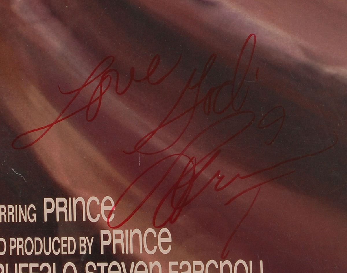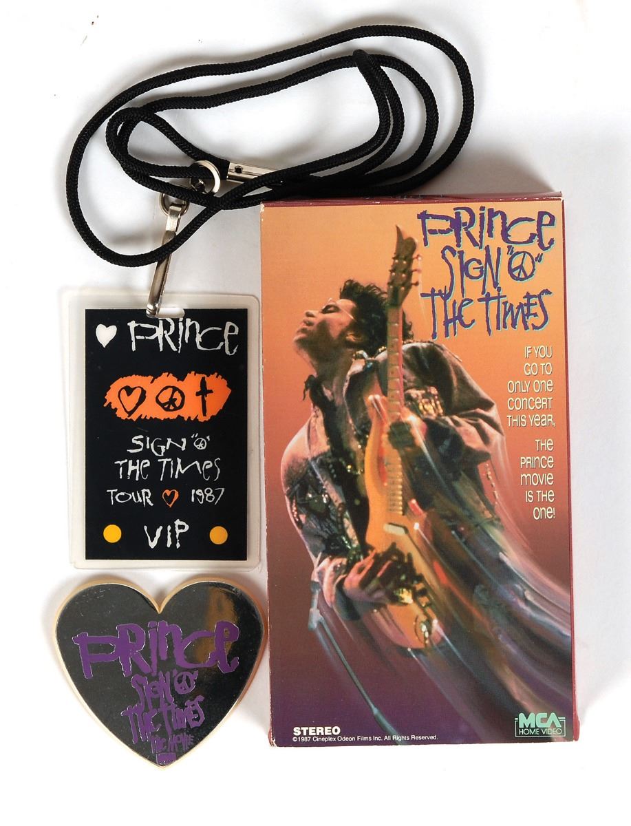 Incredible color 27 x 41 poster for the 1987 concert film Sign o’ the Times, prominently signed in red felt tip, “Love God, Prince,” adding a cross below. Also includes a VHS tape of the same film, a laminated VIP pass for the 1987 Sign ‘o the Times tour, and a heart-shaped mirror pin promoting the movie. Rolled and in fine condition, with scattered creasing and paper loss to left edge of poster.