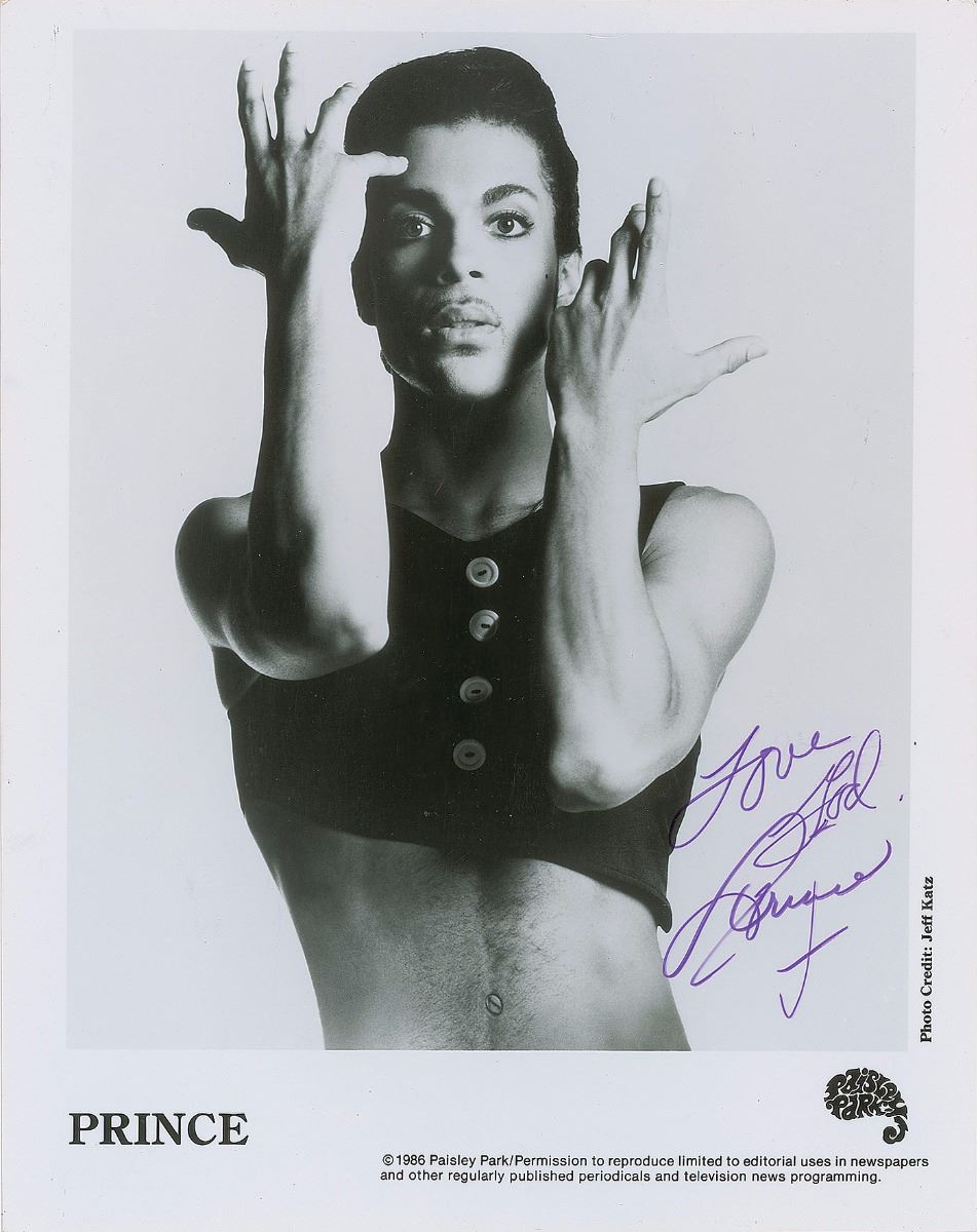 Wonderful glossy 8 x 10 Paisley Park publicity photo of Prince, an image also used for the front cover of his 1986 album Parade, signed in purple felt tip, "Love God, Prince," who adds a cross below. In fine condition.
