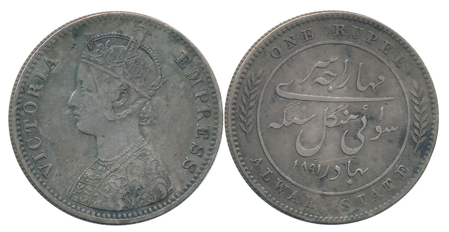 Mangal Singh, Silver Rupee, AD 1891, with the name of Victoria Empress, Obv: Crowned bust to left, Rev: Legend, date within circle (KM# 46). Very fine+.