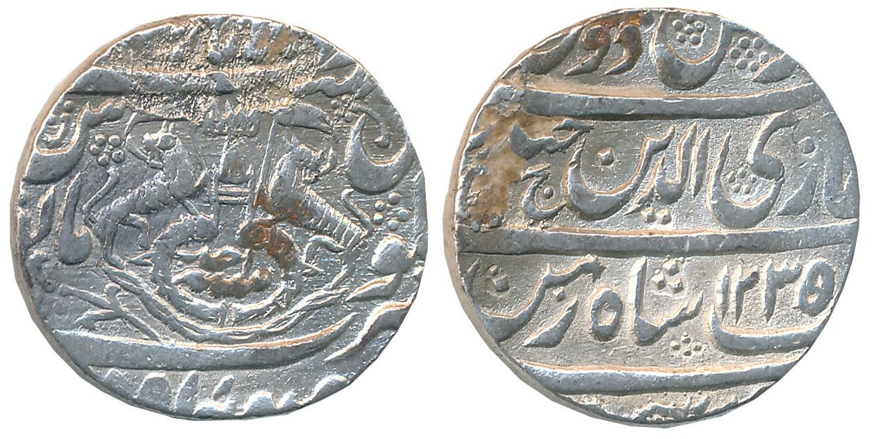 Gazi ud din Haider, Silver Rupee, 10.95g, Suba Awadh Dar ul Amarat Lakhnau Mint, AH 1235/ RY Ahad, Crown flanked by rampant Lions holding flag, two upright Fish below on obverse (Master & Kapoor# 7.22). Very fine.