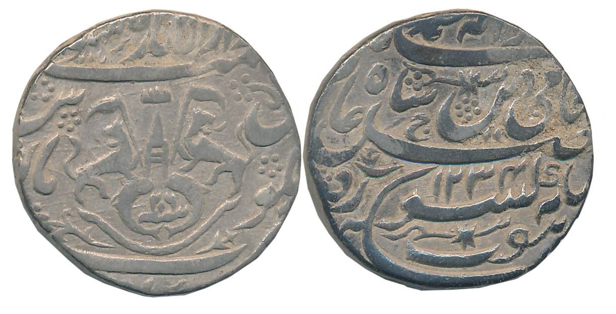 Ghazi ud din Haidar Shah, Silver Rupee, 10.99g, Suba Awadh Dar ul Lakhnau Mint, in the name of Shah Alam II, AH 1234/ RY 26, Crown flanked by rampant Lions holding flag, two upright Fish below on obverse (Master & Kapoor# 7.13). Very fine.