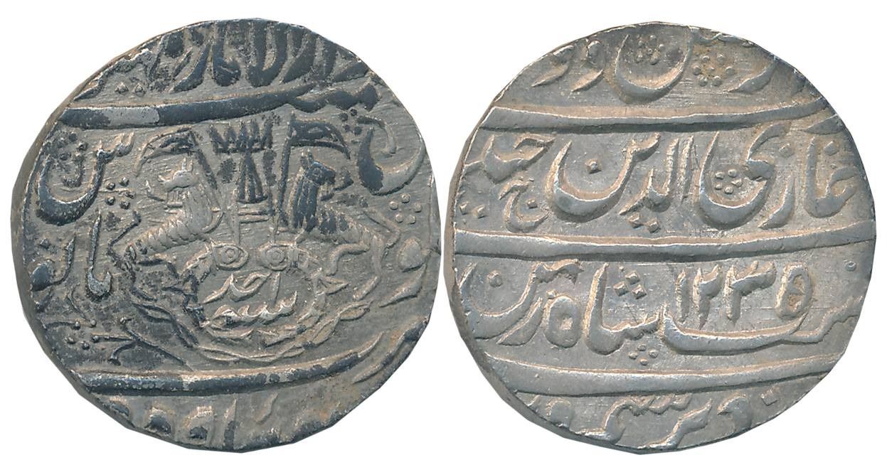 Ghazi ud din Haidar Shah, Silver Rupee, 11.15g, Suba Awadh Dar ul Sultanate Lakhnau Mint, AH 1235/ RY Ahad, Crown flanked by rampart Lions holding flag, two upright Fish below on obverse (Master & Kapoor# 7.22). Very fine.