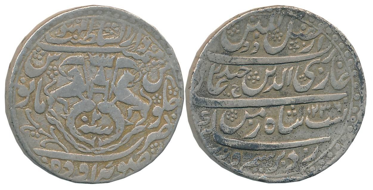 Ghazi ud din Haider Shah, Silver Rupee, 10.94g, Suba Awadh Dar us Sultanate Lakhnau Mint, AH 1236/ RY 2, Crown flanked by rampant Lions holding flag, two upright Fish below on obverse (Master & Kapoor# 7.29). Very fine.