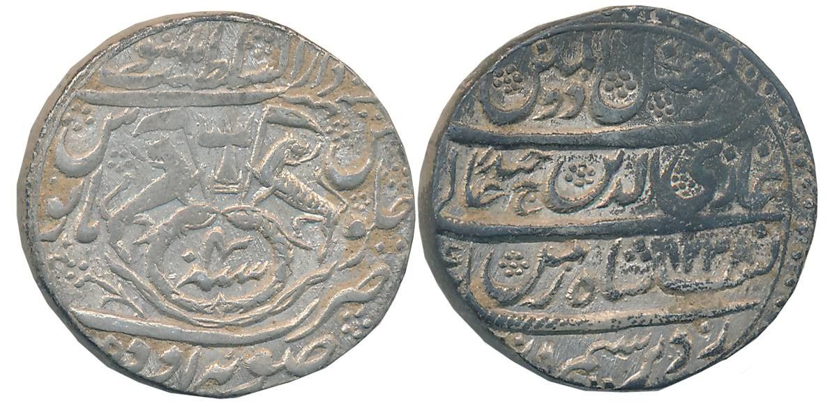 Ghazi ud din Haider Shah, Silver Rupee, 11.14g, Suba Awadh Dar us Sultanate Lakhnau Mint, AH 1238/ RY 4, Crown flanked by rampant Lions holding flag, two upright Fish below on obverse (Master & Kapoor# 7.36). Very fine.