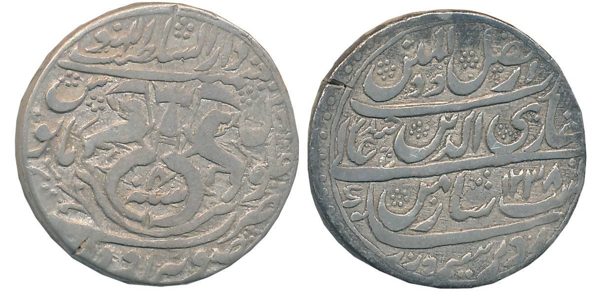 Ghazi ud din Haider Shah, Silver Rupee, 10.91g, Suba Awadh Dar us Sultanate Lakhnau Mint, AH 1238/ RY 4, Crown flanked by rampant Lions holding flag, two upright Fish below on obverse (Master & Kapoor# 7.36). Very fine.