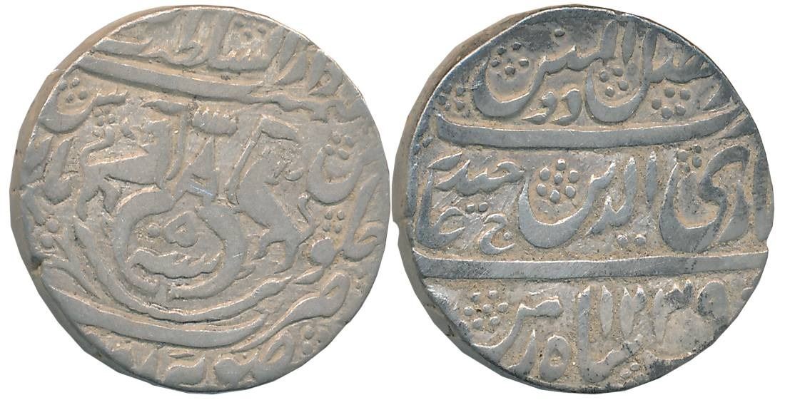 Ghazi ud din Haidar Shah, Silver Rupee, 10.98g, Suba Awadh Dar ul Sultanate Lakhnau Mint, AH 1239/ RY 5, Crown flanked by rampant Lions holding flag, two upright Fish below on obverse (Master & Kapoor# 7.44). Very fine.