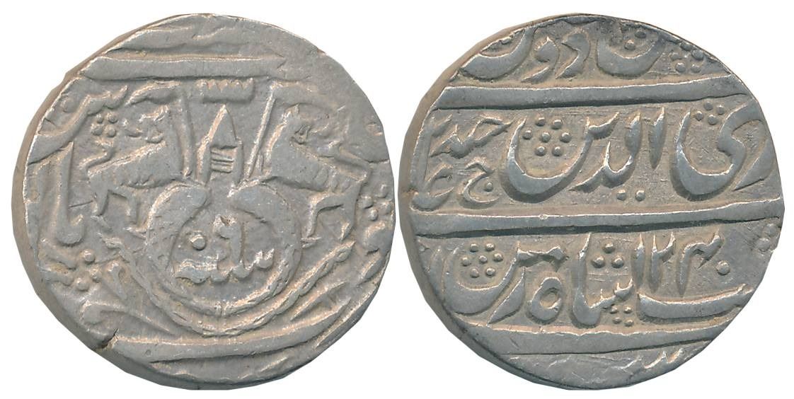 Ghazi ud din Haidar Shah, Silver Rupee, 11.06g, Suba Awadh Dar ul Sultanate Lakhnau Mint, AH 1240/ RY 6, Crown flanked by rampant Lions holding flag, two upright Fish below on obverse (Master & Kapoor# 7.48). Very fine.