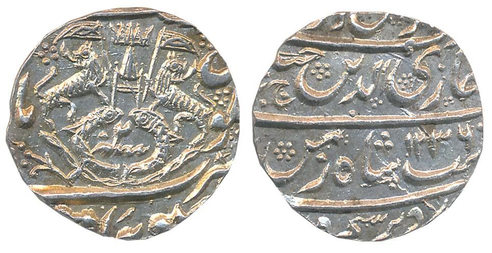 Ghazi ud din Haider Shah, Silver 1/4 Rupee 2.78g Suba Awadh Dar ul Sultanat Lakhnau Mint, AH 1236/ RY 2, Crown flanked by rampart Lions holding flag, two upright Fish below on obverse. About uncirculated, very rare in this grade.