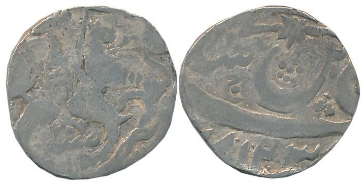 Ghazi ud din Haider Shah, Silver 1/8 Rupee- 2 Anna, 1.30g, Suba Awadh Dar ul Amarat Lakhnau Mint, in the name of Shah Alam II, AH 123(4)/ RY 26, Crown flanked by rampart Lions holding flag, two upright Fish below on obverse (Master & Kapoor# 7.15). Flatness on both sides. Fine.