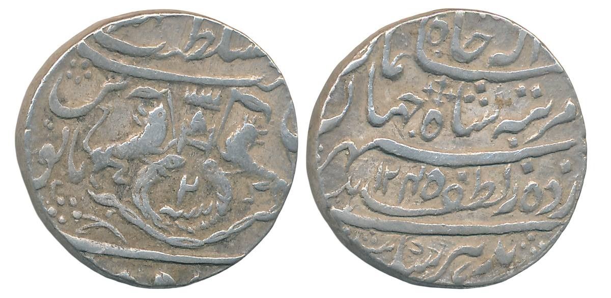 Nasir ud din Haidar Shah, Silver Rupee, 11.11g, Suba Awadh Dar us Sultanate Lakhnau Mint, AH 1245/ RY 2, Crown flanked by rampant Lions holding flag, two upright Fish below on obverse (Master & Kapoor# 8.13). Very fine.