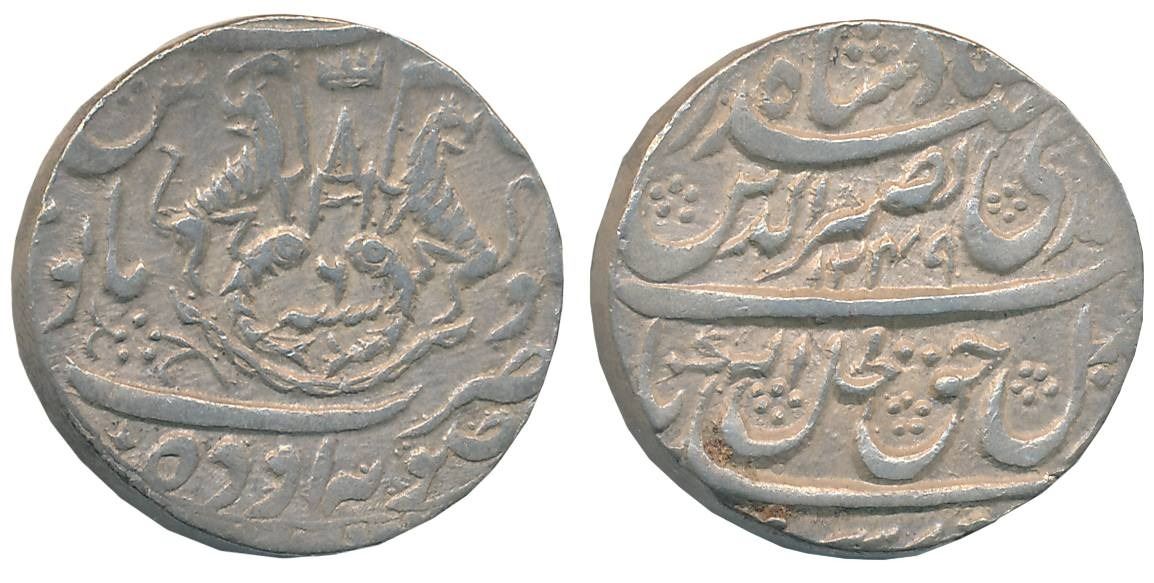 Nasir ud din Haider Shah, Silver Rupee, 11.17g, Dar ul Amrat Lakhnau Suba Awadh Mint, AH 1249/ RY 6, Crown flanked by rampant Lions holding flag, two upright Fish below on obverse (Master & Kapoor# 8.32). Very fine+.