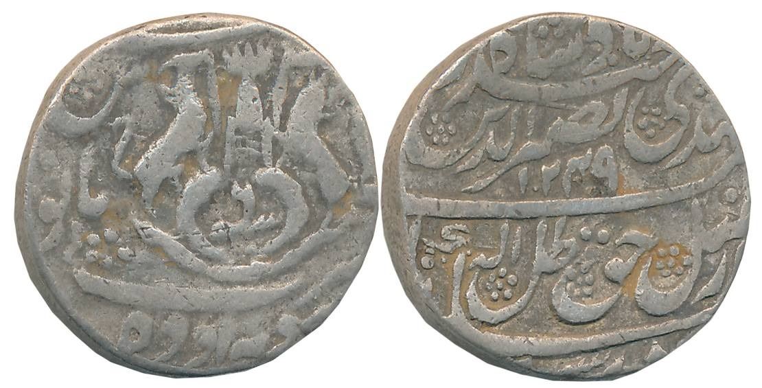 Nasir ud din Haider Shah, Silver Rupee, 11.00g, Dar ul Amrat Lakhnau Suba Awadh Mint, AH 1249/ RY 6, Crown flanked by rampant Lions holding flag, two upright Fish below on obverse (Master & Kapoor# 8.32). About very fine.